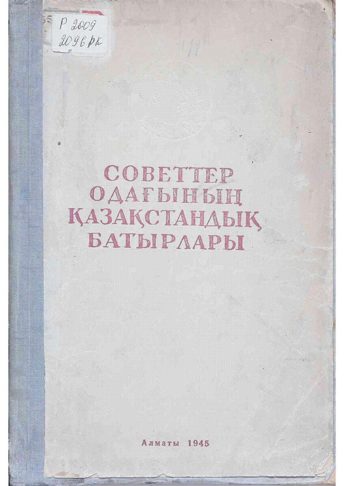 Советтер одағының қазақстандық батырлары [Мәтін] : Документтер мен материалдар жыйнағы ; [құраст.: З. Чумак, Ш. Я. Шафиро ; жауап. ред. Ғ. Б. Дауылбаев] .- Алматы : Қазақтың біріккен мем. баспасы , 1945.– 15000 дана . (мұқ.) 1 .– 324 б., порт. . (мұқ.) : 140 тг.