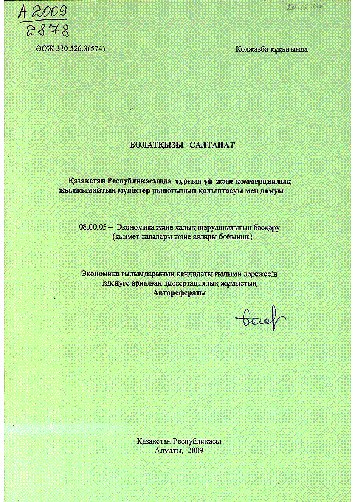 Қазақстан Республикасында тұрғын үй және коммерциялық жылжымайтын мүліктер рыногының қалыптасуы мен дамуы [Мәтін] : Экономика ғылымдарының кандидаты ғылыми дәрежесін ізденуге арналған дисс. жұмыстың авторефераты. 08.00.05 мамандығы бойынша / Болатқызы, Салтанат ... – Алматы : [Б.ж.], 2009. - 30 б. . – Библиогр.: б. 26 . – 100 дана – көрсетілмеген : [Б.ж.]