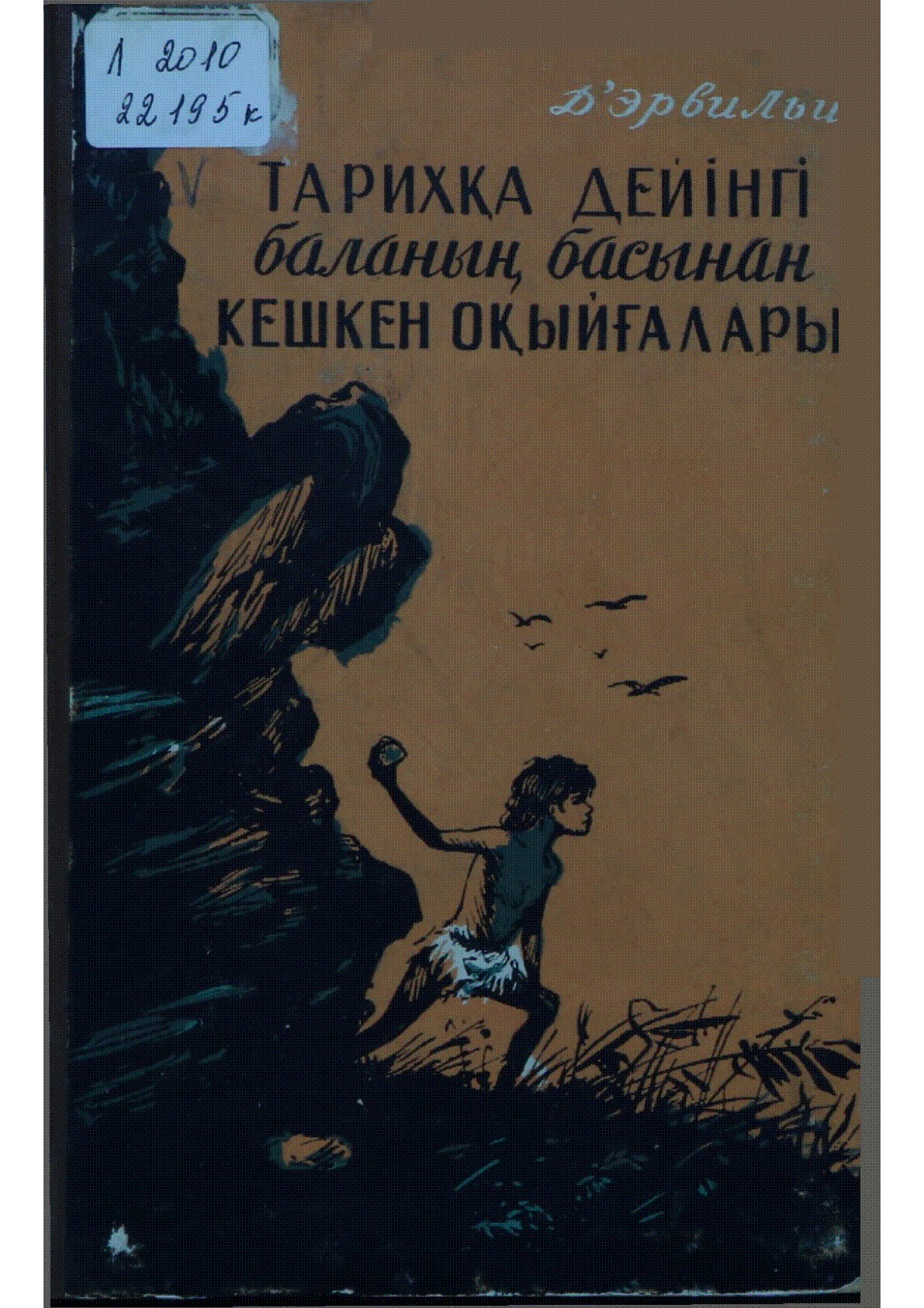 Тарихқа дейінгі баланың басынан кешкен оқыйғалары [Мәтін] / Д`Эрвильи ... – Алматы : Қаз. көркем әдеб. бас, 1957. - 104 б., суретті; . . – 10000 дана – көрсетілмеген (мұқ.) : 100 тг.