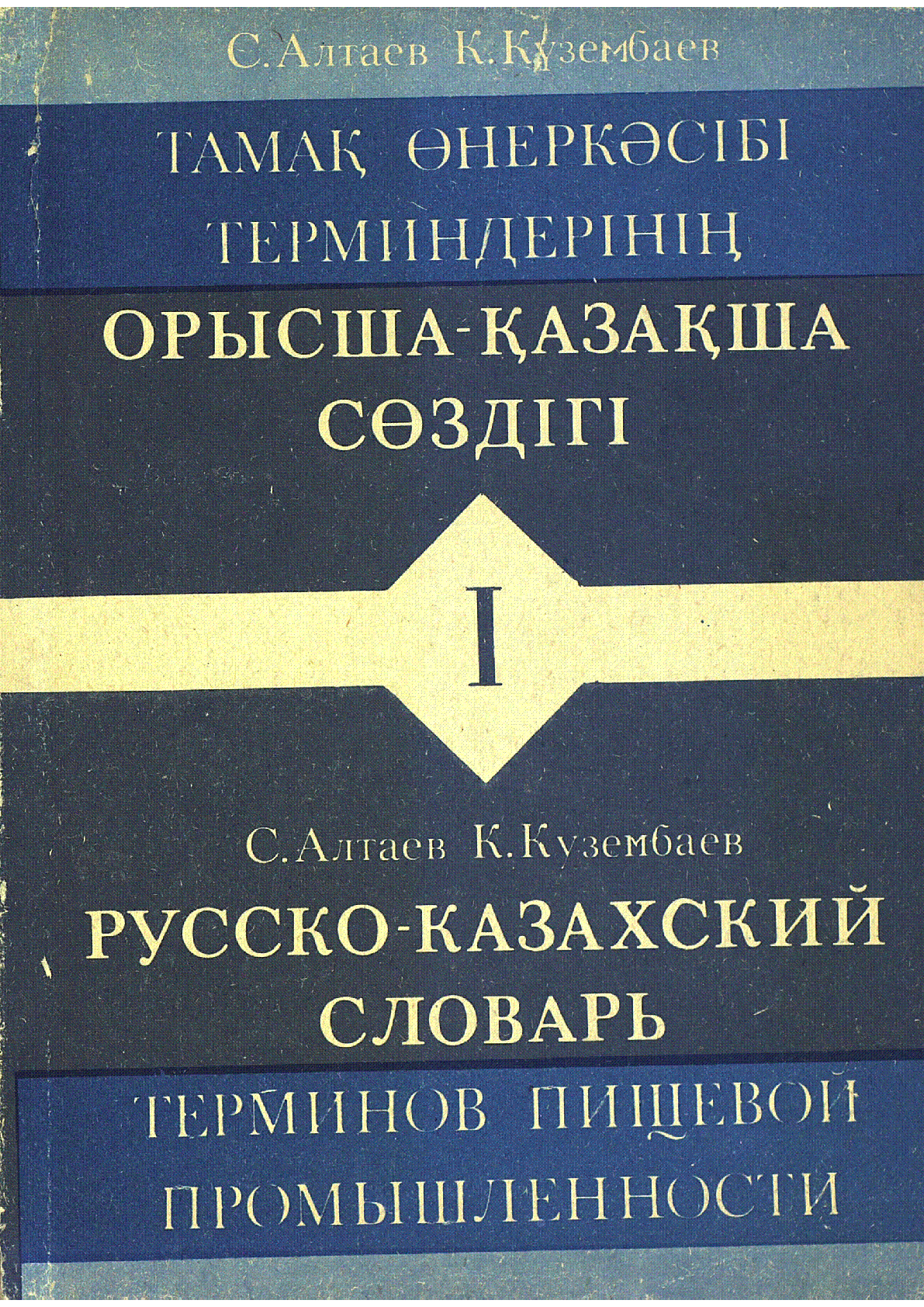 Тамақ өнеркәсібі терминдерінің орысша-қазақша сөздігі [Мәтін] / С. Алтаев, К. К. Күзембаев- Алматы : Рауан , 1991.– 1000 дана . – ISBN 5-625-01058-7 (1 б.) - Қазақ ССР Халыққа білім беру министрлігі бекіткен . 1-бөлім . А-К– 157 б.