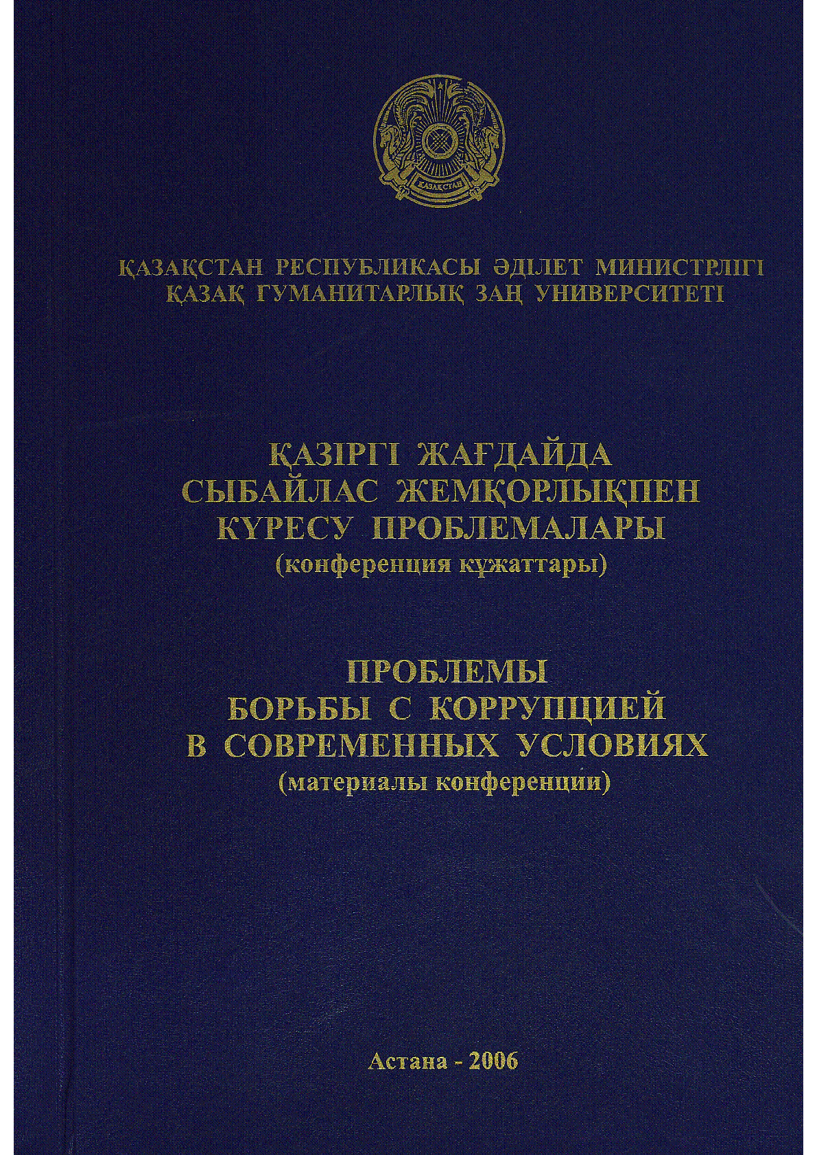 Проблемы борьбы с коррупцией в современных условиях: опыт, проблемы и перспективы развития антикоррупционного законодательства : (материалы международной научно-практической конференции 29-30 мая 2006 года) / ; Министерство юстиции Республики Казахстан ; Казахский гуманитарно-юридический университет... – Астана : [Б. и.], 2006. - 585 с. - Текст на рус. и каз. языках . – Библиогр.: в конце докл. . – не указан