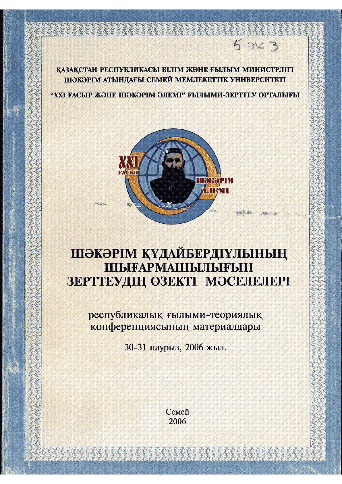 Шәкәрім Құдайбердіұлының шығармашылығын зерттеудің өзекті мәселелері : Республикалық ғылыми-теориялық конференциясының материалдары / ... – Семей : [Б. ж.], 2006. - 376 б., суретті; - 30-31 наурыз, 2006 жыл . . – 9965-716-63-3