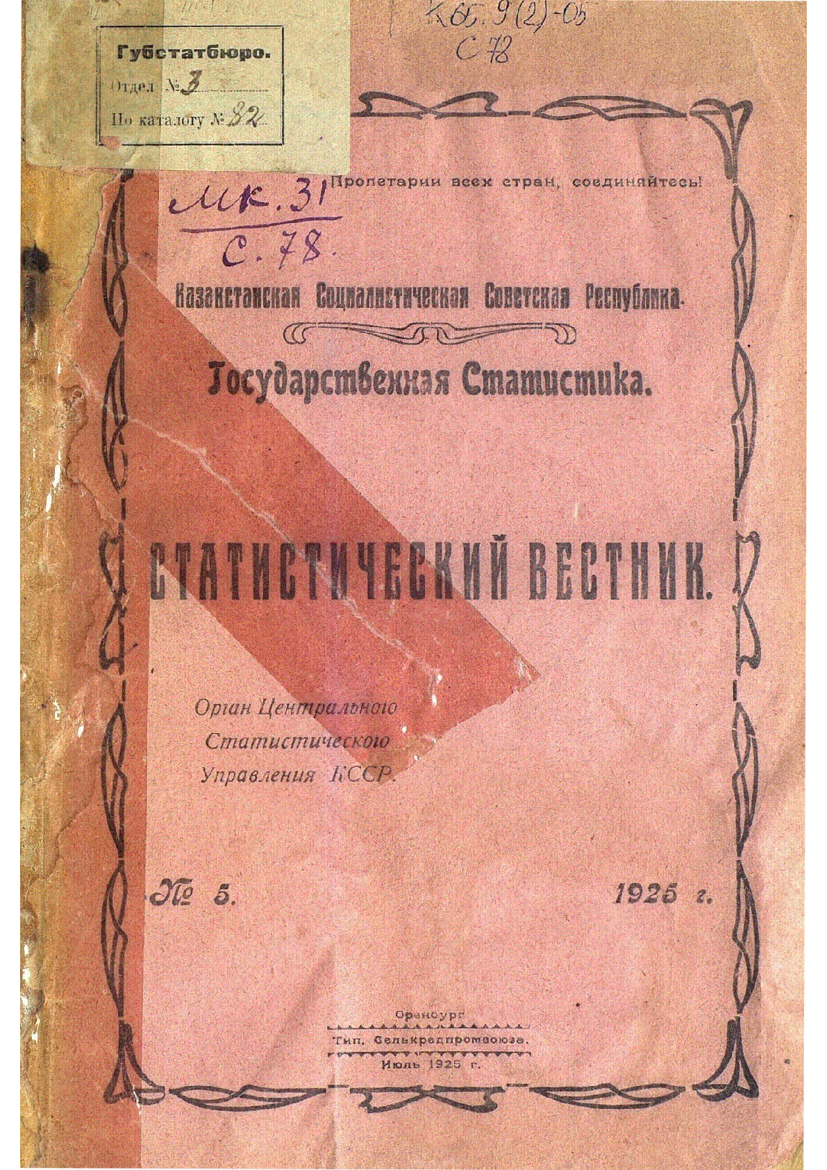 Статистический вестник [Текст] : орган Центрального Статистического Управления КССР ; Киргизская Социалистическая Советская Республика ; Государственная Статистика- Оренбург : Тип. Селькредпромсоюза , 1925. ٠5 . 1925– 111 с., ил., табл. .