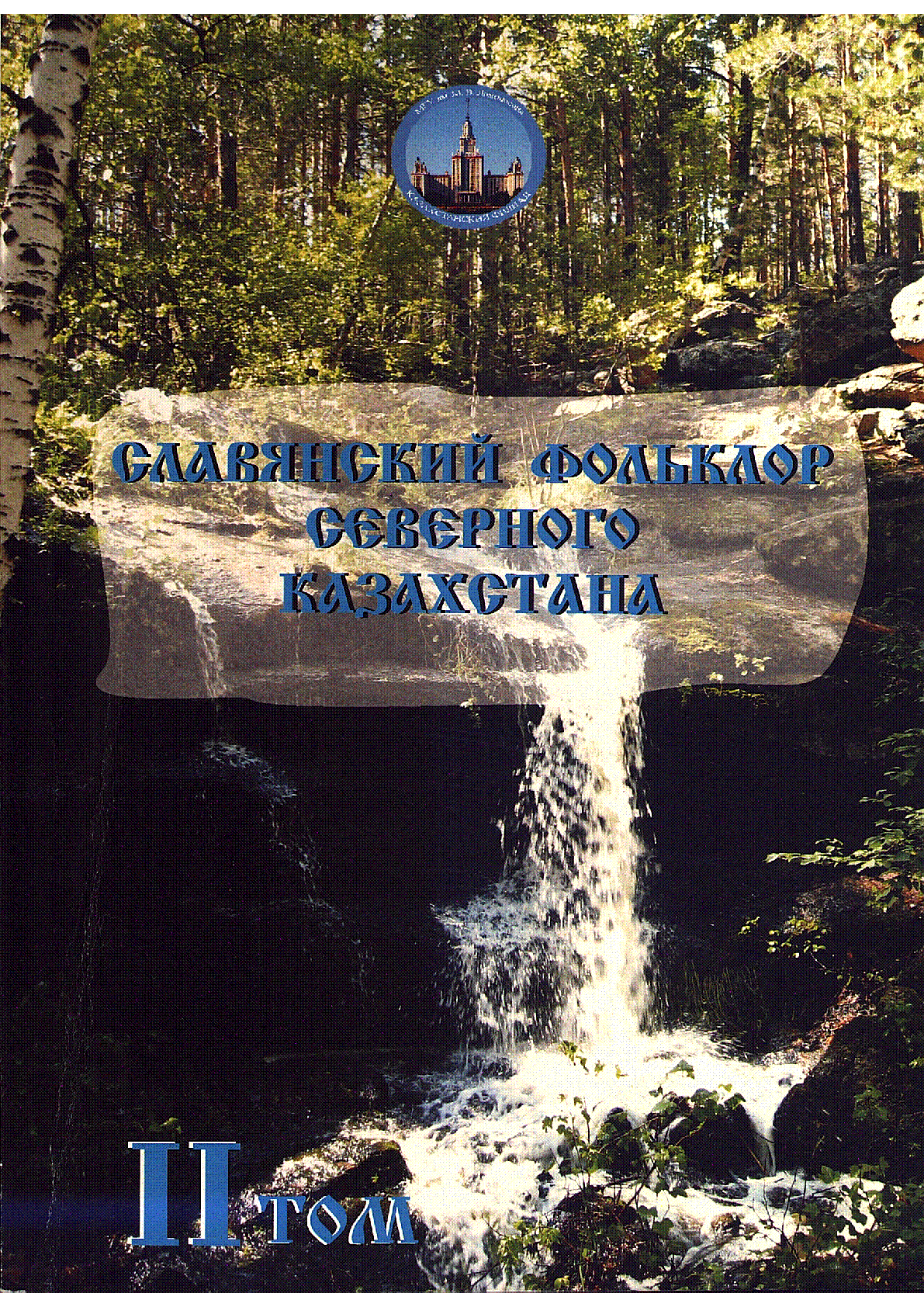 Славянский фольклор Северного Казахстана : (на материале фольклорных экспедиций Казахстанского филиала МГУ им. М. В. Ломоносова 2003-2007 гг.) : в 2-х т. ; Министерство образования и науки Республики Казахстан ; Казахстанский филиал Московского Государственного университета имени М. В. Ломоносова ; [отв. ред. Г. И. Власова ; сост. Е. А. Доценко] .- Астана : [Б. и.] , 2008. – 9965-21-397-6 Т. 2 . Народная поэзия– 271 с., [2] л. ил., ил. .