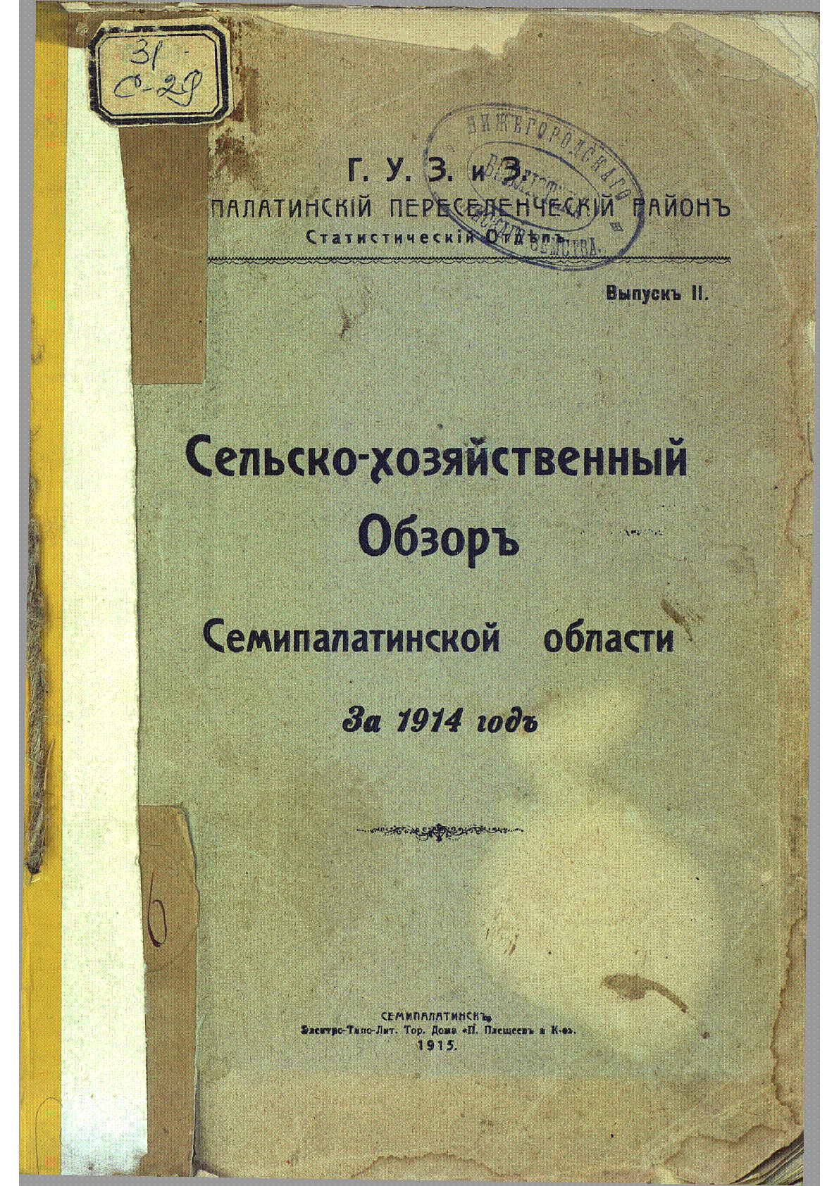Сельскохозяйственный обзор Семипалатинской области за 1914 год [Текст] ; Г. У. З. и З ; Семипалатинский переселенческий район ; Статистический отдел ; [Е. Тимофеев] .- Семипалатинск : П. Плещеев и К-о - С кн. оцифрованы 492 с. . Вып. II .– 453 с., табл. .