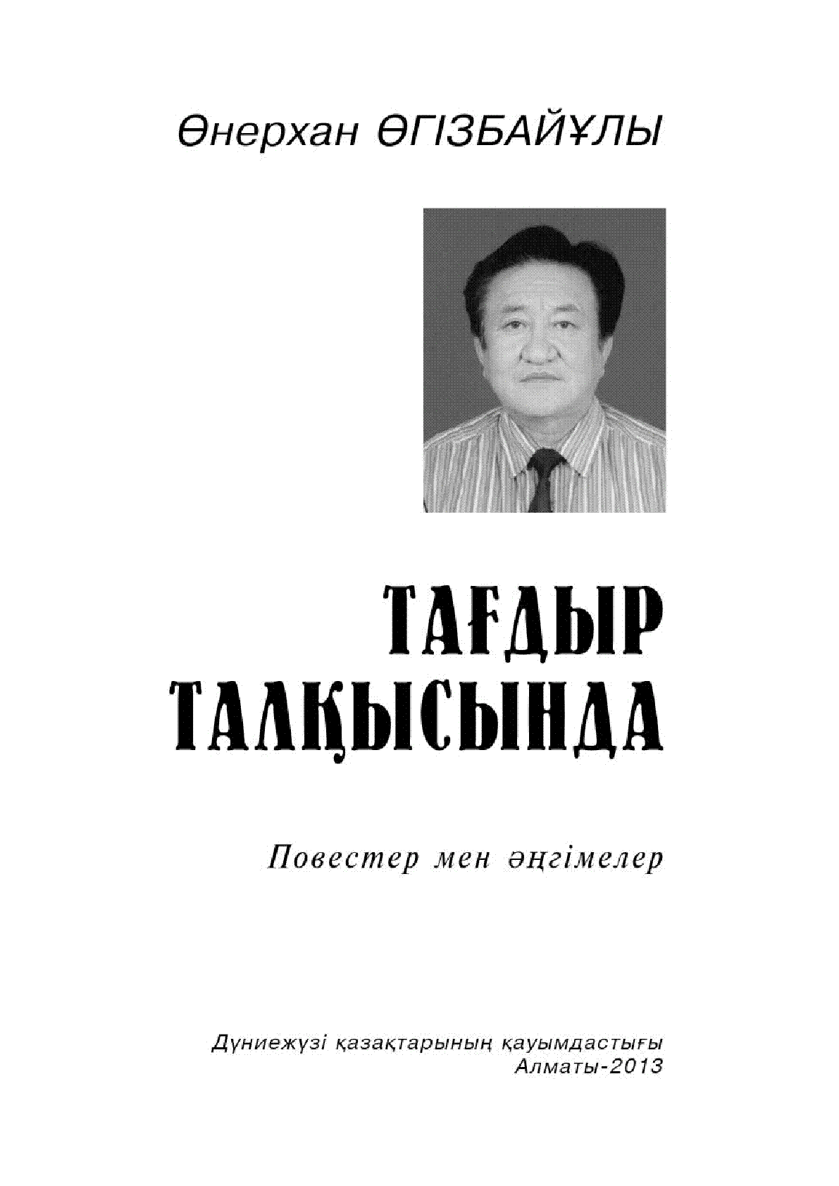 Тағдыр талқысында [Мәтін] : повестер мен әңгімелер / Ө. Өгізбайұлы ; Дүниежүзі қазақтарының қауымдастығы ; [редакторы С. Рәсілов]... – Алматы : Атажұрт, 2013. - 190, [1] б.– (Шетелдегі қазақтар. Қауымдастық кітапханасы. - Қазақстан Республикасы Мәдениет және ақпарат министрлігі Ақпарат және мұрағат комитетінің "Әдебиеттің әлеуметтік маңызды түрлерін басып шығару" бағдарламасы бойынша шығарылды . . – 2000 дана – ISBN 978-601-7023-65-2 (мұқ.) : 446 тг.
