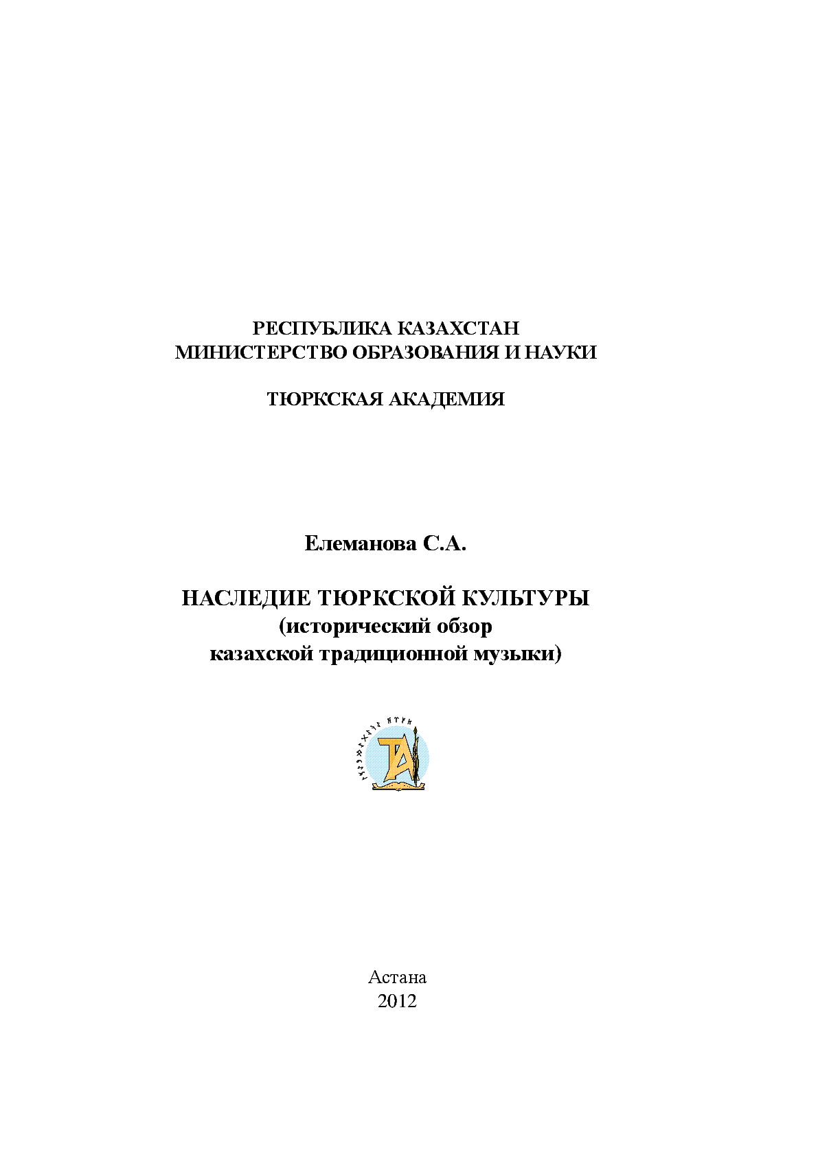 Наследие тюркской культуры (исторический обзор казахской традиционной музыки) [Text] / С. А. Елеманова ... – Алматы : Кантана-пресс, 2012. - 408 с., ноты;– (Современная тюркология. = Қазіргі түркология, Modern turkology. / гл. ред. Ш. Ибраев . – Библиогр.: с. 322-336 . – 500 экз. – 978-601-80173-2-2 (в пер.) : 1283 тг.