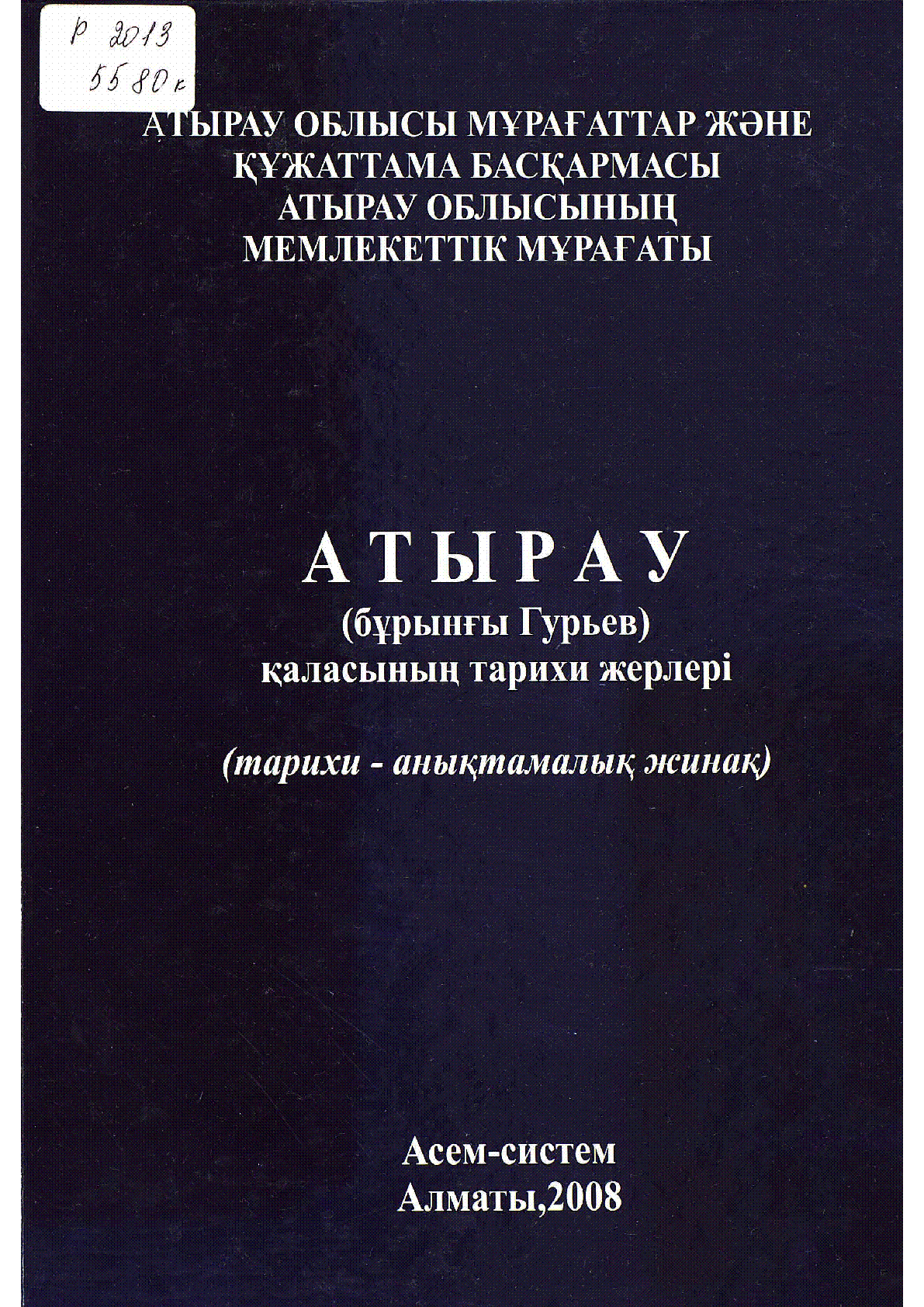 Атырау (бұрынғы Гурьев) қаласының тарихи жерлері [Text] : (тарихи-анықтамалық жинақ) / ; Атырау облысы мұрағаттар және құжаттама басқармасы, Атырау облысының мемлекеттік мұрағаты... – Алматы : Асем-систем, 2008. - 160 б., сурет.; - Мәтіні қазақ және орыс тілд. . – Библиогр. 159 б. . – 500 дана – 978-601-80014-2-0 (мұқ.) : 40 тг.
