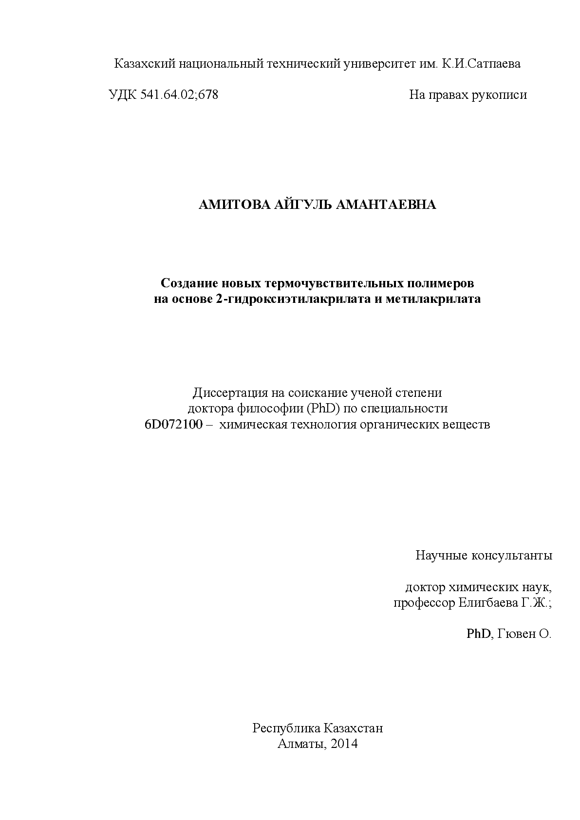 Создание новых термочувствительных полимеров на основе 2-гидроксиэтилакрилата и метилакрилата [Текст] : дис. ... д-ра филос. (PhD) : 6D072100 - химическая технология органических веществ / А. А. Амитова . – .. – Алматы : [б. и.], 2014. - 102 л., ил.; . – Библиогр.: л. 91-102 . – [б. т.] (в пер.) : 300 тг.