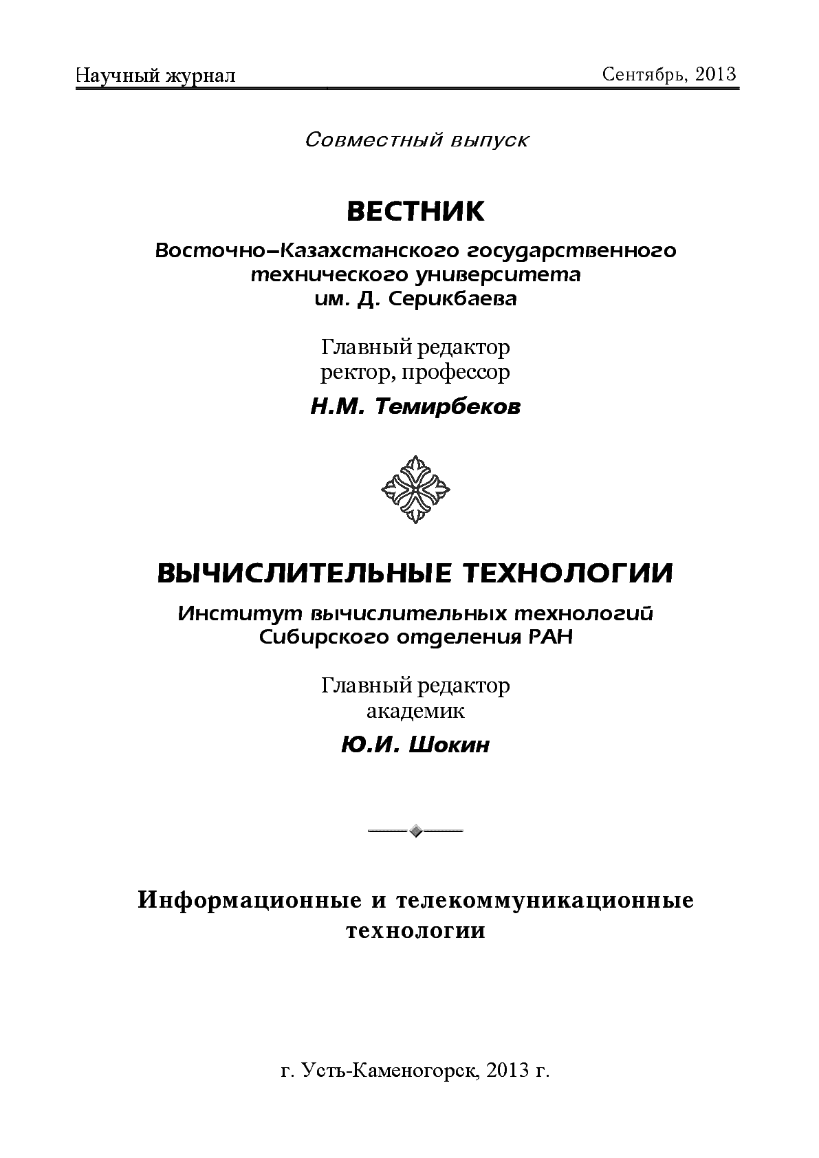 Вестник Восточно-Казахстанского государственного технического университета им. Д. Серикбаева. Вычислительные технологии [Text] : научный журнал : изд. с 1998 г. : совместный выпуск ; Институт вычислительных технологий Сибирского отделения РАН ; Восточно-Казахстанский государственный технический университет им. Д. Серикбаева ; гл. ред.: Н. М. Темирбеков, Ю. И. Шокин .- Усть-Каменогорск : ВКГТУ , 2013.– 350 экз. . – не указан Библиогр.: в конце ст. Информационные и телекоммуникационные технологии . Ч. 4– 347 c. : [б. ц.]