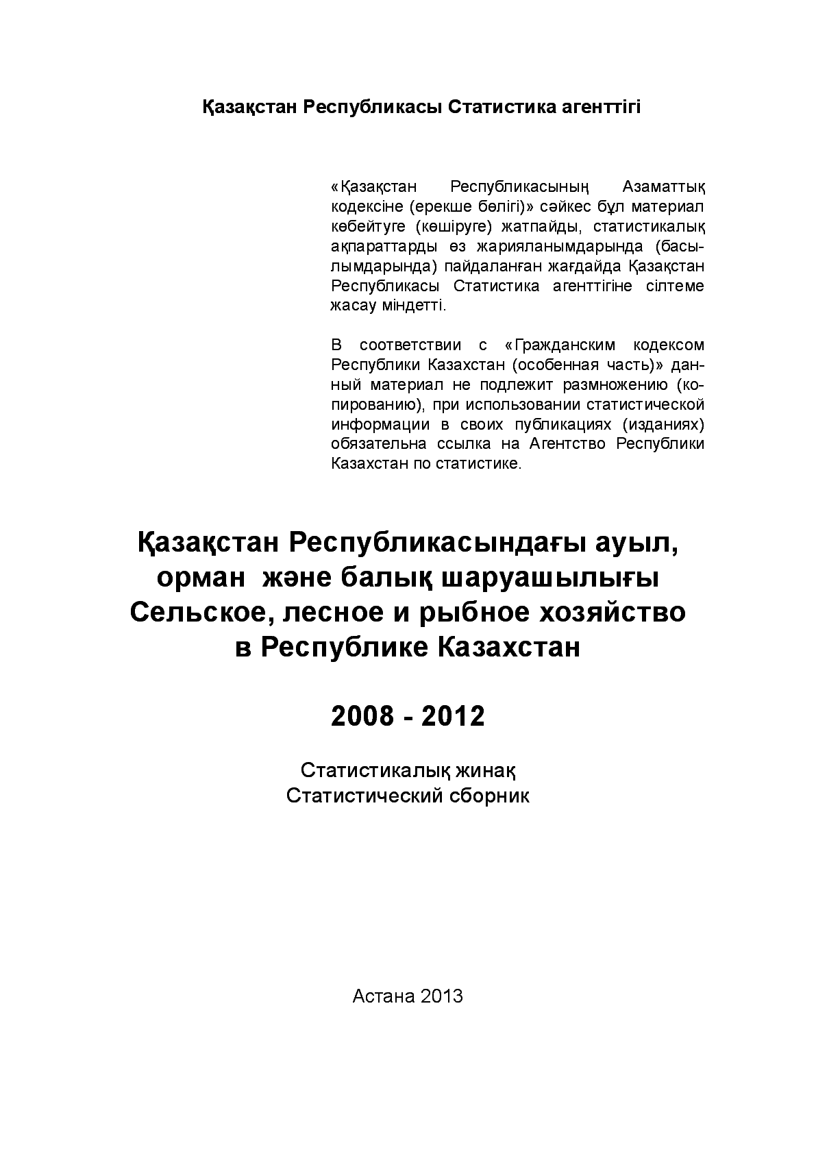 Қазақстан Республикасындағы ауыл, орман және балық шаруашылығы 2008-2012 = Сельское, лесное и рыбное хозяйство в Республике Казахстан 2008-2012 [Text] : статистикалық жинақ / ; [бас ред. Ә. А. Смайылов]... – Астана : [б. ж.], 2013. - 216 б., табл.; . . – 300 дана – көрсетілмеген : 40 тг.