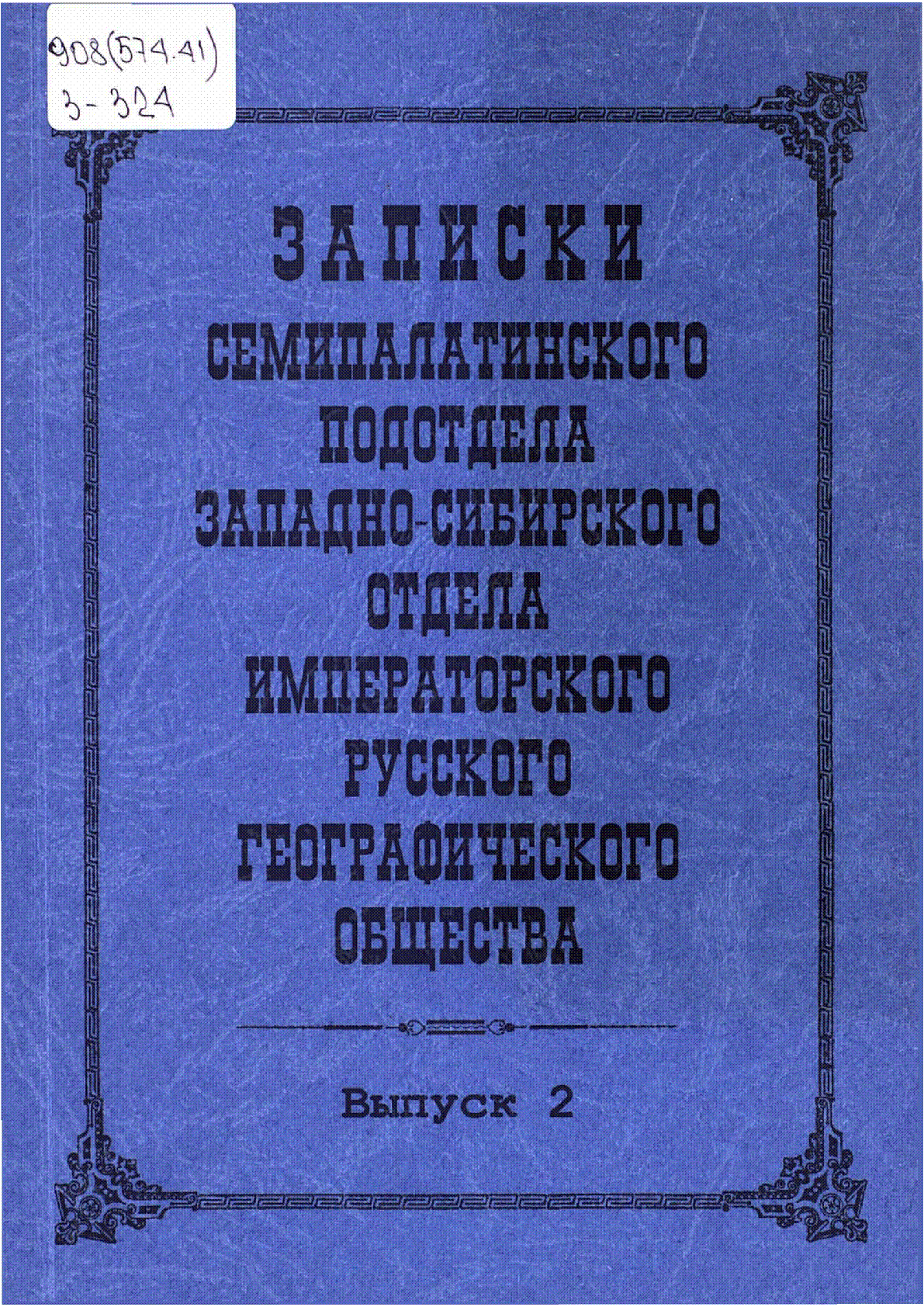 Записки Семипалатинского подотдела Западно-Сибирского отдела Императорского Русского Географического Общества [Text], [Text] ; [сост.: Т. У. Тусунбаева, Ж. Ж. Урымбаева ; отв. ред. Г. Т. Касымова] . – Факс. изд. ,- Семей : [б. и.] , 2013.– 100 экз. . – 978-601-248-400-7 Библиогр. в сносках Вып. 2 .– 306 с. : 30 тг.