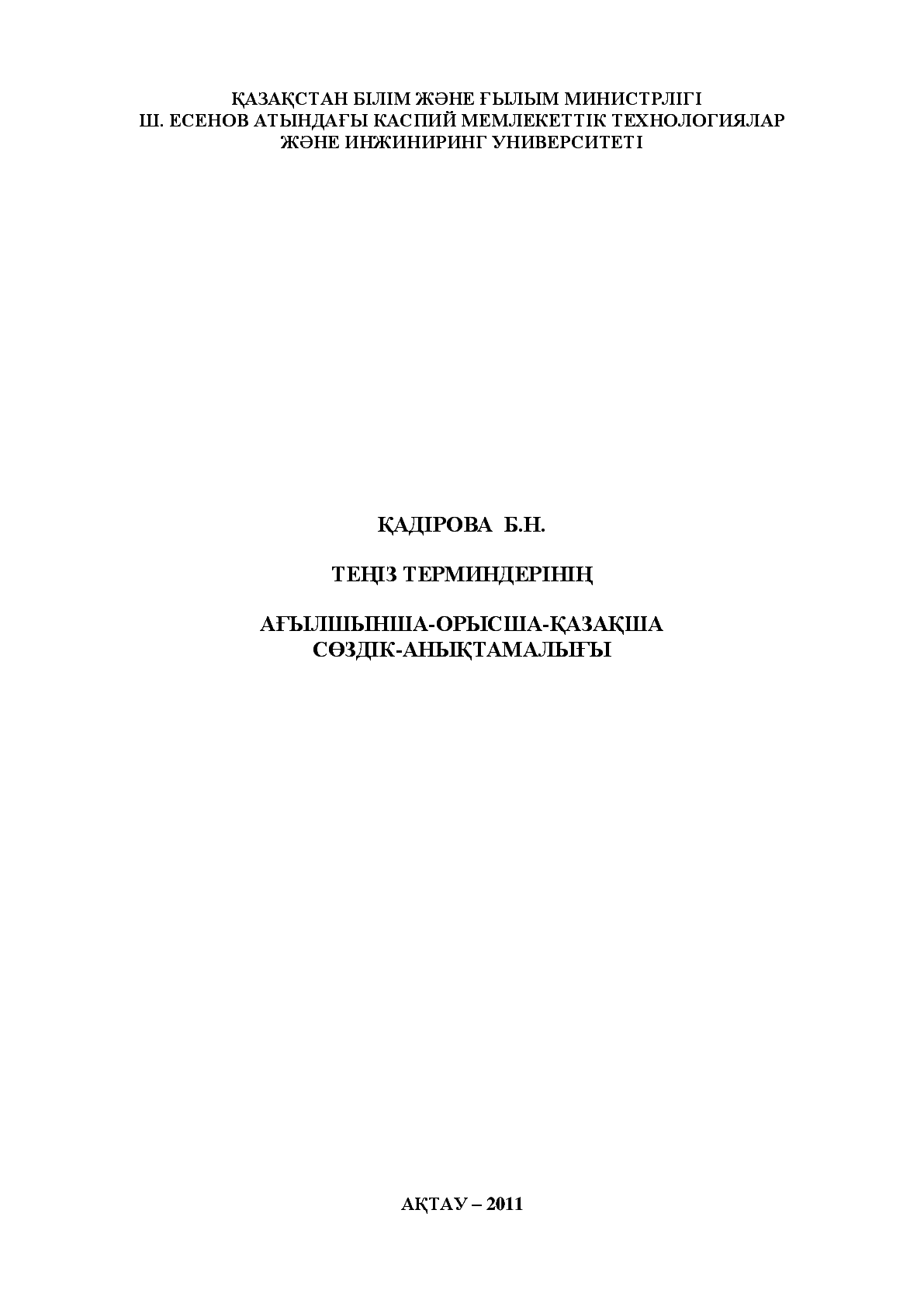 Теңіз терминдерінің ағылшынша-орысша-қазақша сөздік анықтамалығы [Text] / Б. Н. Қадірова ... – Ақтау : [б. ж.], 2011. - 83 б. . – Библиогр.: 82 б. . – 20 дана – 978-601-7276-88-1 : [б. ж.]