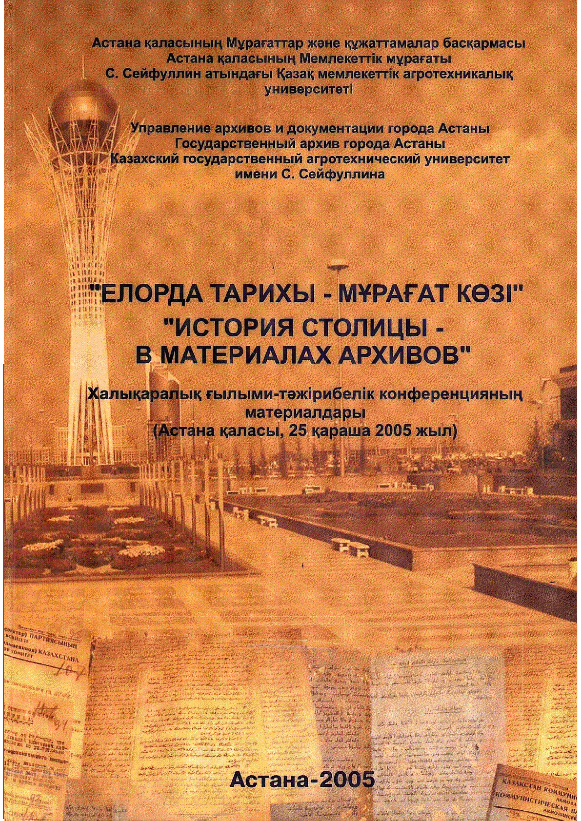 Елорда тарихы - мұрағат көзі = История столицы - в материалах архивов [Text] : халықаралық ғылыми-тәжірибелік конференцияның материалдары (Астана қаласы, 25 қараша 2005 жыл) / ; Астана қаласының мемлекеттік мұрағаты, Астана қ. мұрағаттар және құжаттамалар басқармасы, С. Сейфуллин атын. Қазақ мемлекеттік агротех. ун-ті, [жауап. ред. Ғ. А. Алпысбаева ; жинақты құраст. З. Қ. Хабдуллина]... – Астана : [б. ж.], 2005. - 200 б., сурет.; - Мәтіні қазақ және орыс тілд. . . – 200 дана : [б. ж.]