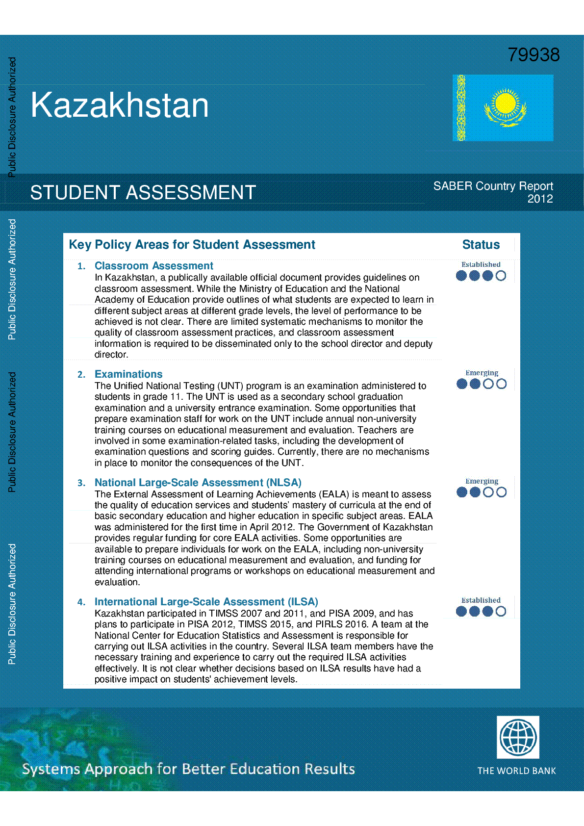 Kazakhstan Student Assessment [Text] : SABER Country Report 2012 / ... – Washington : The World Bank, 2013. - 52 p., tables, figures; . – References : 52 p. . – [n. c.]