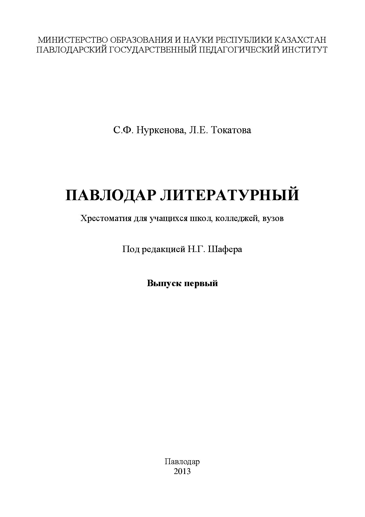 Павлодар литературный [Text] : Хрестоматия для учащихся школ, колледжей, вузов / С. Ф. Нуркенова Токатова Л. Е. ; под ред. Н. Г. Шафера ; М-во образования и науки РК ; Павлод. гос. пед. ин-т .- Павлодар : [б. и.] , 2013.– 500 экз. . – 978-601-267-214-5 - Содерж. авт.: П. Васильев, Д. П. Приймак, И. Сарафанов, Г. А. Бешкарев, Вс. В. Иванов, А. Е. Новоселов, А. С. Сорокин . Библиогр.: с. 278 Вып. 1 .– 281 с.