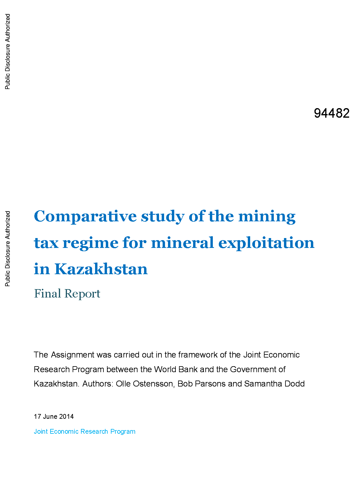 Comparative study of the mining tax regime for mineral exploitation in Kazakhstan [Text] : final report / O. Ostensson Parsons B., Dodd S. ... – Oxford : Oxford Policy Management Limited, 2014. - 100 p., tables, figures; . – References at the end of articles . – [n. c.]