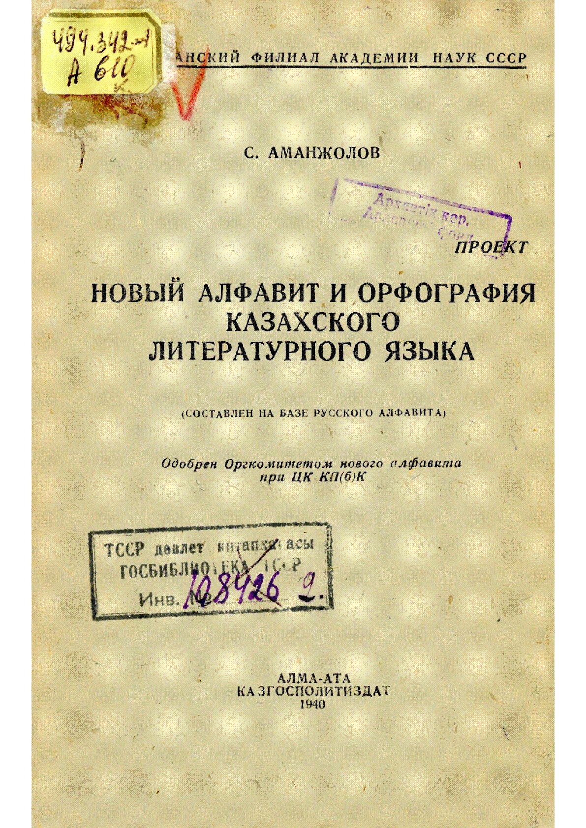 Новый алфавит и орфография казахского литературного языка [Текст] : (составлен на базе русского алфавита) / С. Аманжолов ; Каз. ФАН СССР... – Алма-Ата : Казгосполитиздат, 1940. - 31 с. - Шора Сарыбаев қоры . . – 2000 экз. : 6 к.