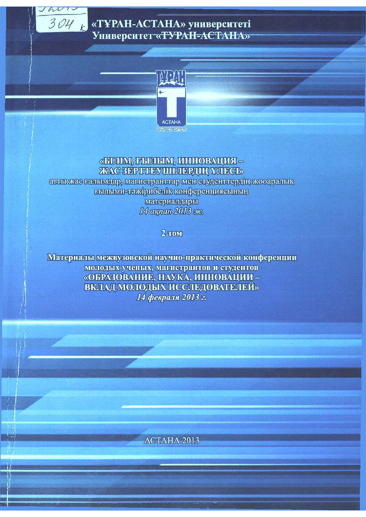 "Білім, ғылым, инновация - жас зерттеушілердің үлесі" атты жас ғалымдар, магистранттар мен студенттердің жооаралық ғылыми-тәжірибелік конференциясының материалдары. 2013 ж. 14 ақпан. 2 т. [Text], [Text] ; Тұран-Астана ун-ті, [ред. алқасы: А.Г. Джапарова] .- Астана : [б. ж.] , 2013.– 500 дана . – 978-601-214-213-6, 978-601-214-211-2 - қазақ, орыс тілд. . Библиогр. мақала соңында 2 т. .– 463 б. : 30 тг.