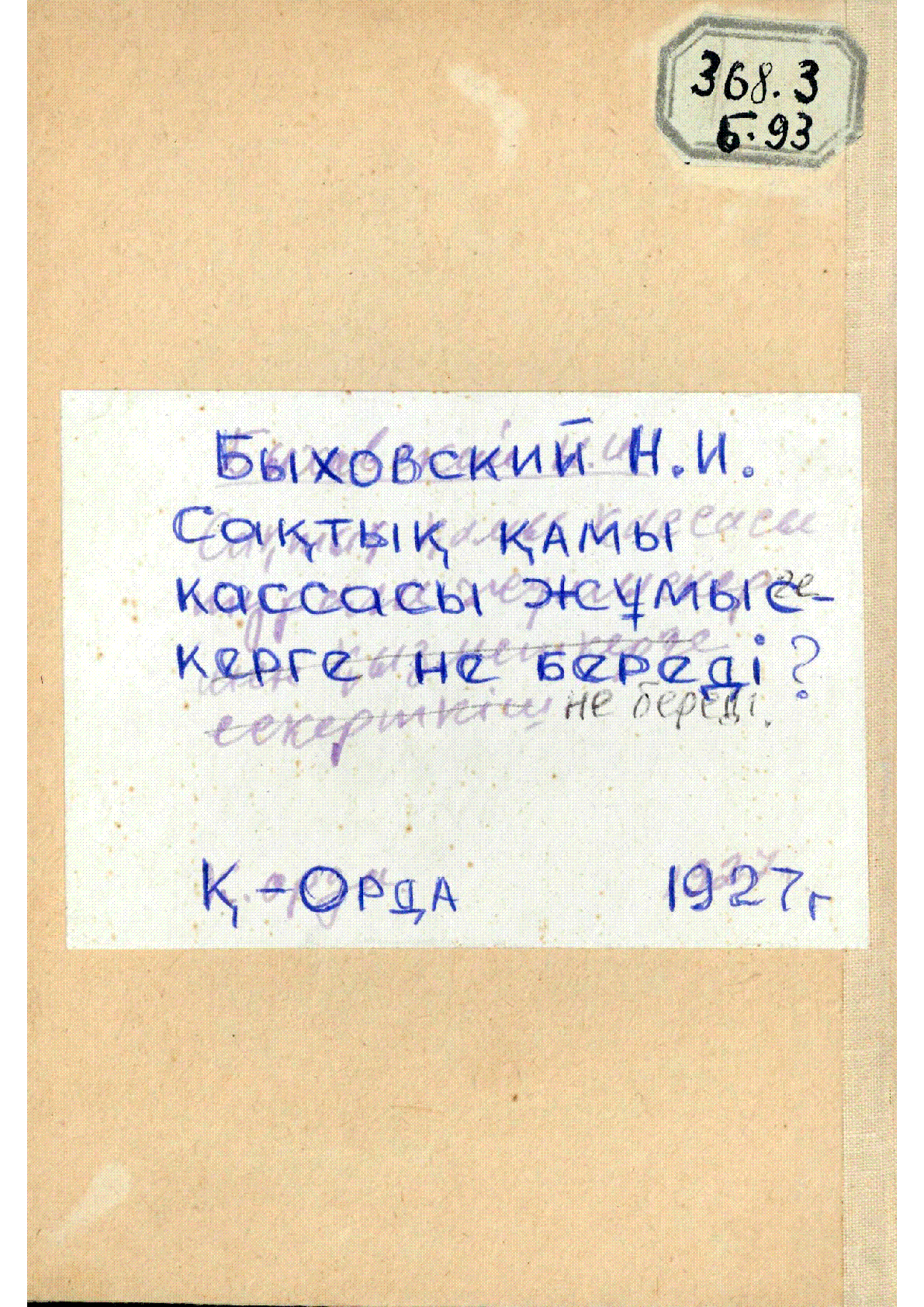Сақтық қамы кассасы жұмыскерлерге не береді [Text] : Немченко дәйектемесімен / Быховский Н.И. ... – Қызылорда : Қазақстан мемлекет баспасы, 1927. - 48 б. - Араб графикасы. . . – 3000 дана