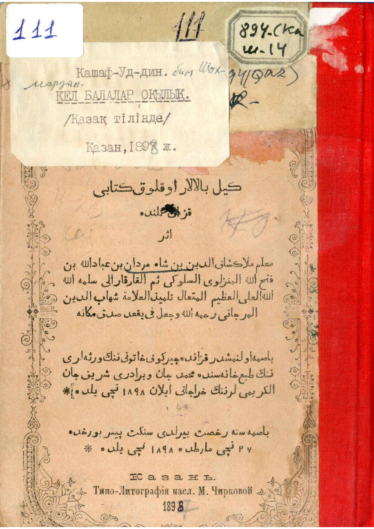 Кел балалар оқылық кітабы = كيل بالالار اوقلوق كتابى [Мәтін] / Кашшафуддин ; Барадаран Мұхамеджан уә Шәрифжан әл-Кәримиләрнің харажаты илан басма олынмышдүр... – Қазан : Типо-лит. насл. М.А. Чирковой, 1898. - 8 бет - Мәтін араб графикасымен жазылған . .