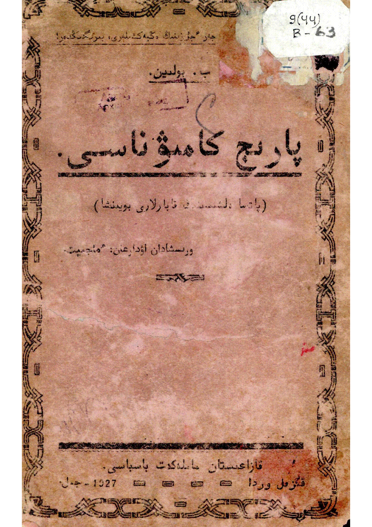 Париж коммунасы = پارىج كامىۋناسى [Мәтін] : патша елшісінің хабарлары бойынша / Б. Волин ; ауд. М. Дәулетбайұлы... – Қызылорда : Қазақстан мемлекет баспасы, 1927. - 48 б. - Мәтін араб графикасымен жазылған . . – 3 000 дана