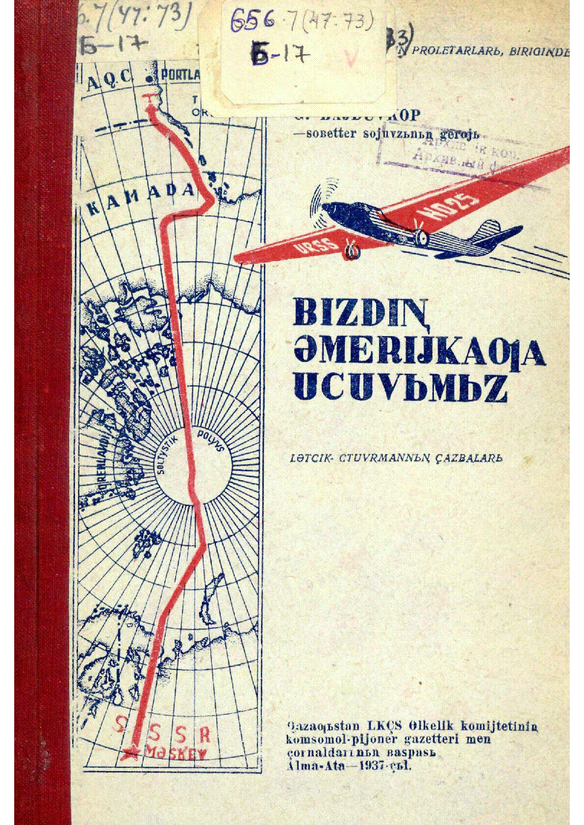 Біздің Америкаға ұшуымыз [Text] : летчик-штурманның жазбалары / Байдуков Г. ... – Алма-Ата : Қазақстан ЛКЖС өлкелік комитетінің комсомол-пионер газеттері мен журналдары баспасы, 1937. - 37 бет - Латын графикасымен. . . – 50000 дана