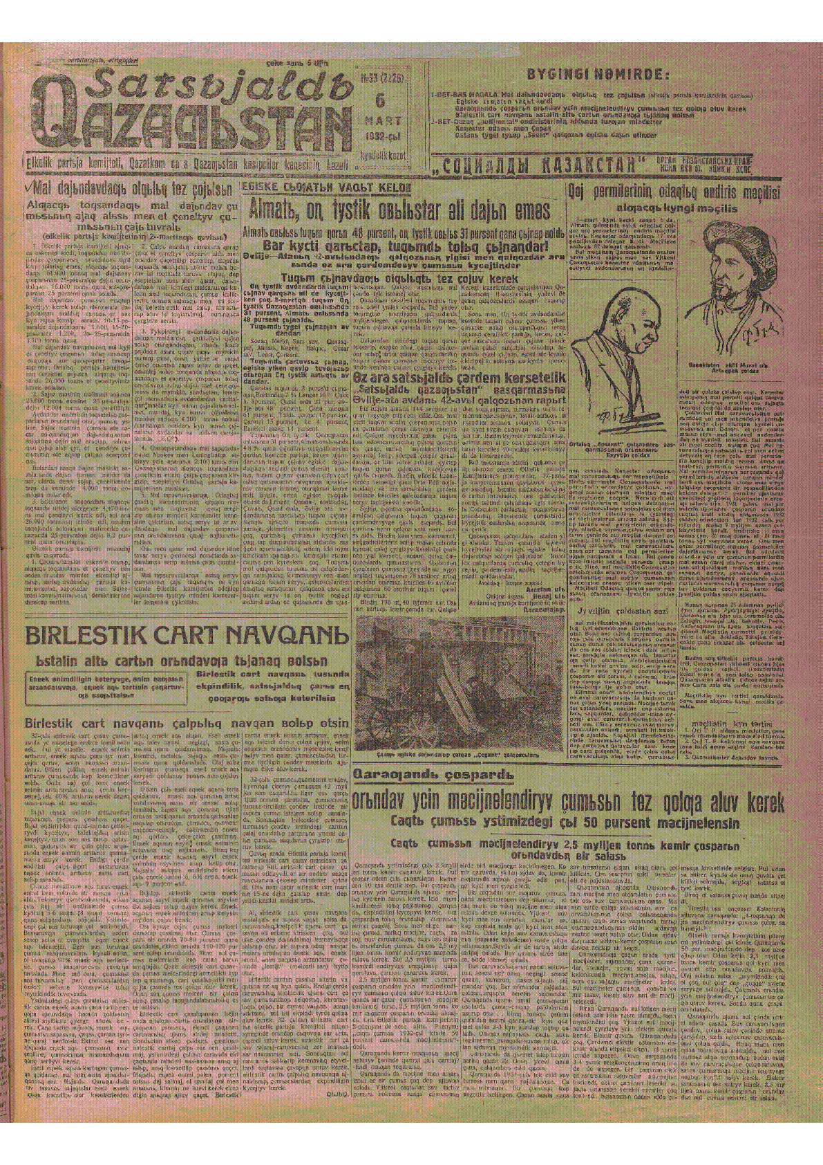 Социалды Қазақстан, 1932 ж. = Satsьjaldь Qazaqьstan : 6 март, 1932 ж.. – Алма-Ата : [Типолит-КСЦНХ], 1932. - .– [т.ж.]. № 53 (2226). - [т.ж.]