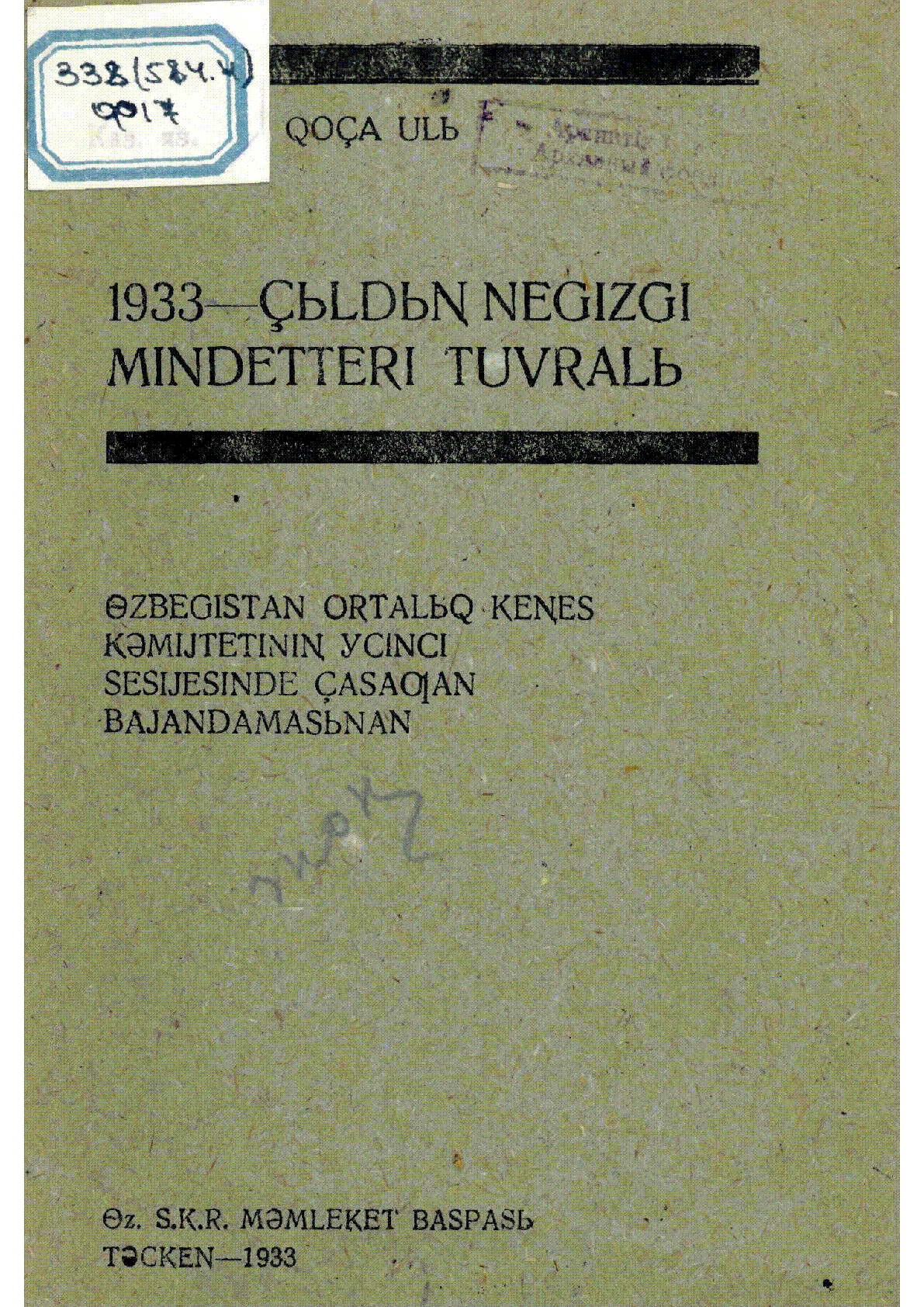 1933 жылдың негізгі міндеттері туралы [Text] : Өзбекстан орталық кеңес комитетінің III сессиясында жасаған баяндамасынан / Қожаұлы Ф. ... – Ташкент : Өзбекстан мемлекет баспасы, 1933. - 23 бет - Латын графикасымен. . . – 1000 дана
