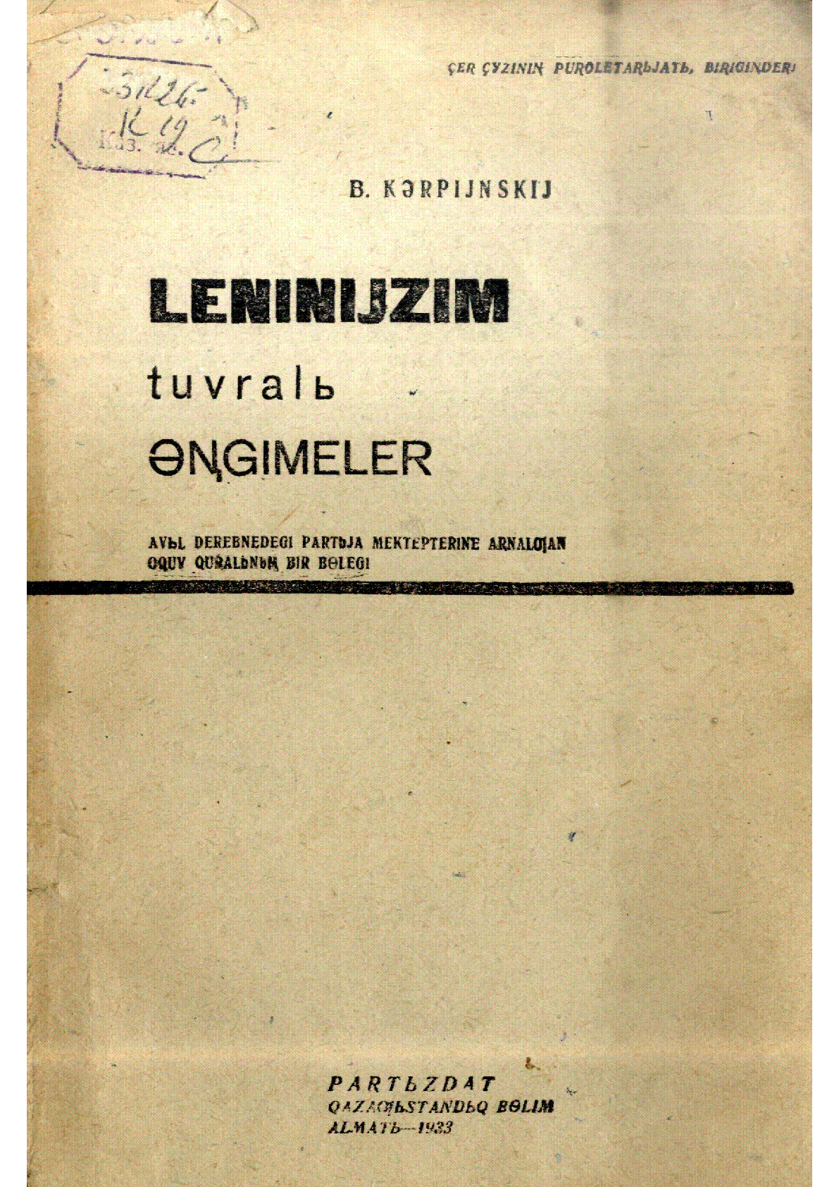 Ленинизм туралы әңгімелер = Беседы о ленинизме [Text] : Ауыл, деревнядағы партия мектептеріне арналған оқу құралының бір бөлігі / Карпинский В. ... – Алма-Ата : Орталық партия комитетінің баспасы, Қазақстандық бөлім, 1933. - 95 бет . . – 32000 дана