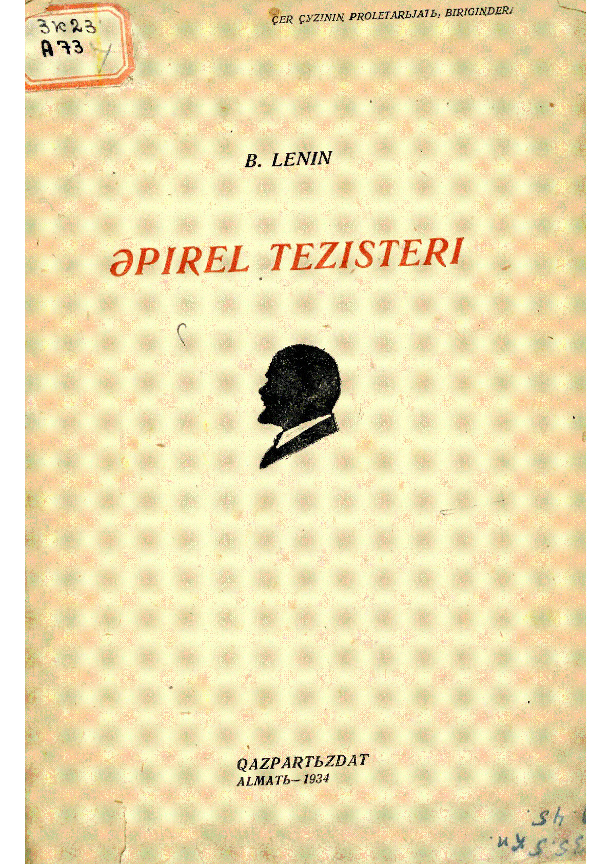 Апрель тезистері [Text] / Ленин В.И. ... – Алматы : Қазақстан партия баспасы, 1934. - 52 бет - Латын графикасымен. . . – 7000 дана