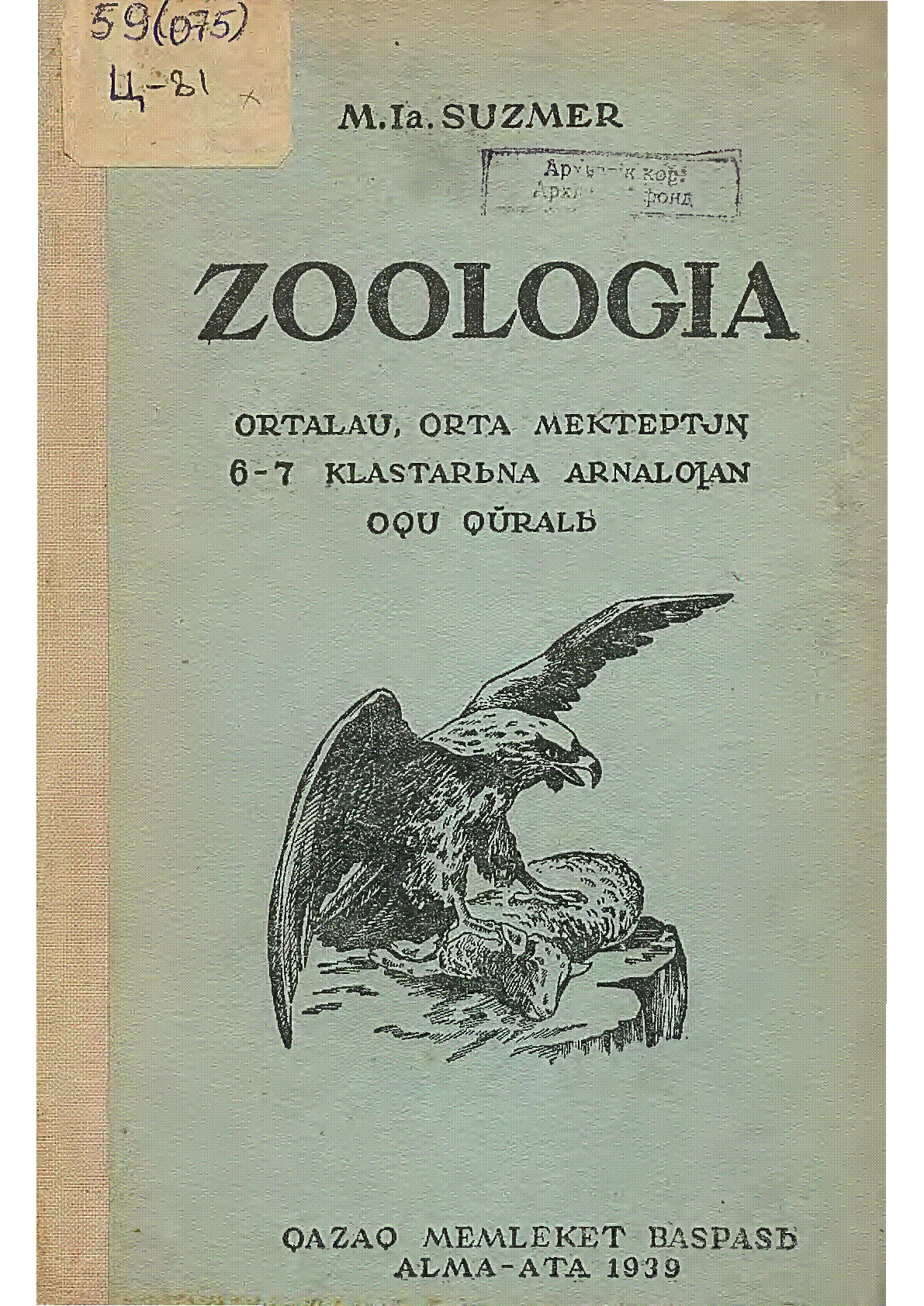 Зоология [Мәтін] : орталау және орта мектептердің 6-7 кластарына арналған оқу құралы / М. Я. Цузмер ; Қаз. ССР Оқу Халық Комиссариаты. – 6-бас. ., түзет.. – Алма-Ата : Қазақ мемлекет баспасы, 1939. - 261, [1] б., суретті; - Мәтін латын қарпімен қазақ тілінде . . – 40000 дана (мұқ.) : 40 тг.