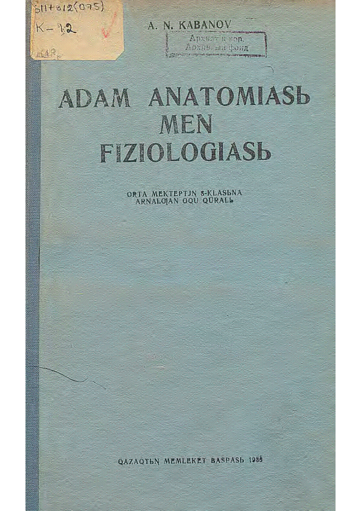 Адам анатомиясы мен физиологиясы [Мәтін] : орта мектептің 8-класына арналған оқу құралы / А. Н. Кабанов ; [жауапты ред. Т. Аблаев] ; Қаз. ССР Халық Комиссариаты... – Алма-Ата : Қазақ мемлекет баспасы, 1938. - 180, [1] б., суретті; - Мәтін латын қарпімен қазақ тілінде . . – 7150 дана (мұқ.) : 30 тг.