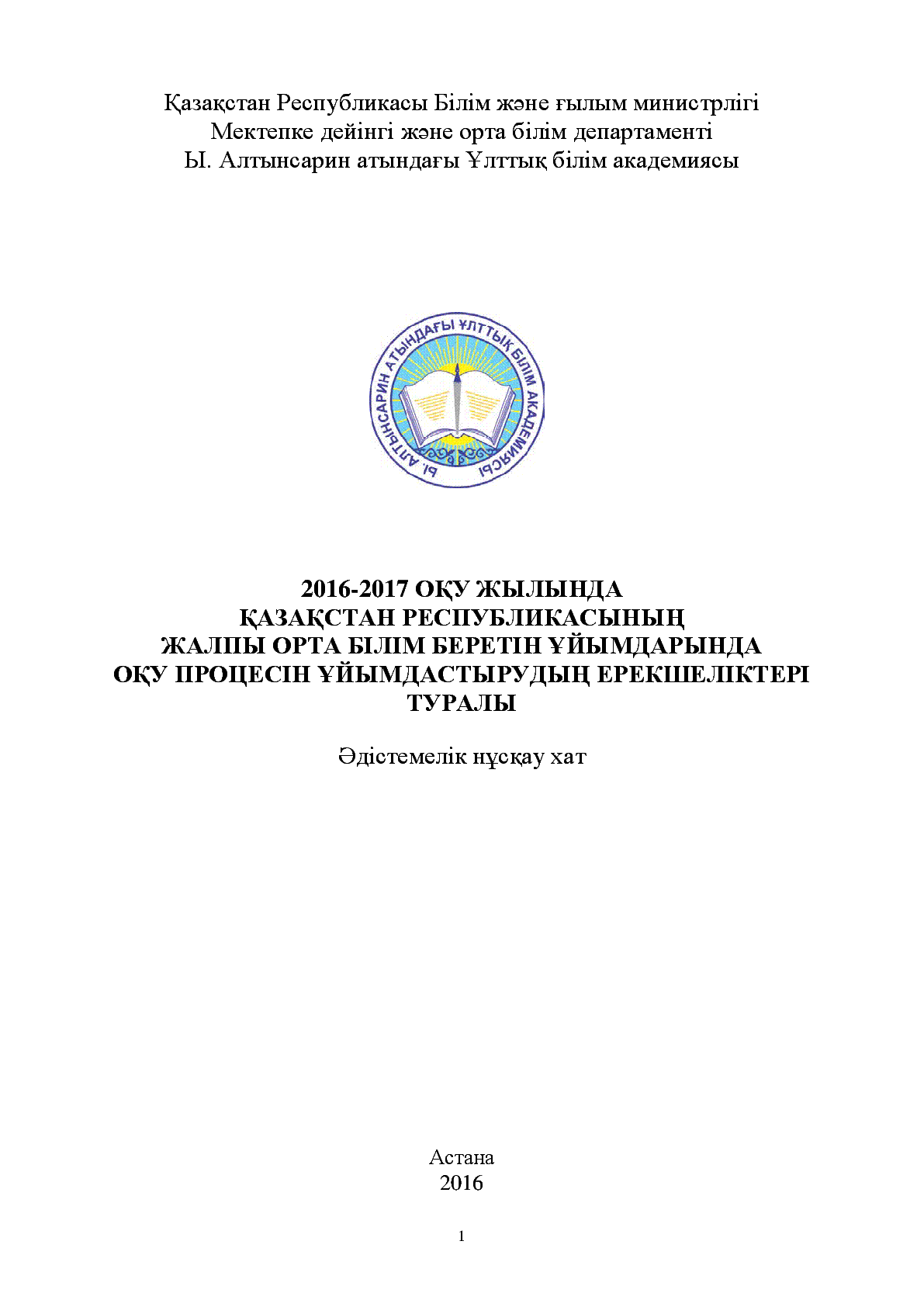 2016-2017 оқу жылында Қазақстан Республикасының жалпы орта білім беретін ұйымдарында оқу процесін ұйымдастырудың ерекшеліктері туралы [Text] : Әдістемелік нұсқау хат / ; ҚР Білім және ғылым м-гі ; Ы.Алтынсарин атын. Ұлттық білім акад.... – Астана : [б.ж.], 2016. - 257 б. . . – [т. ж.]