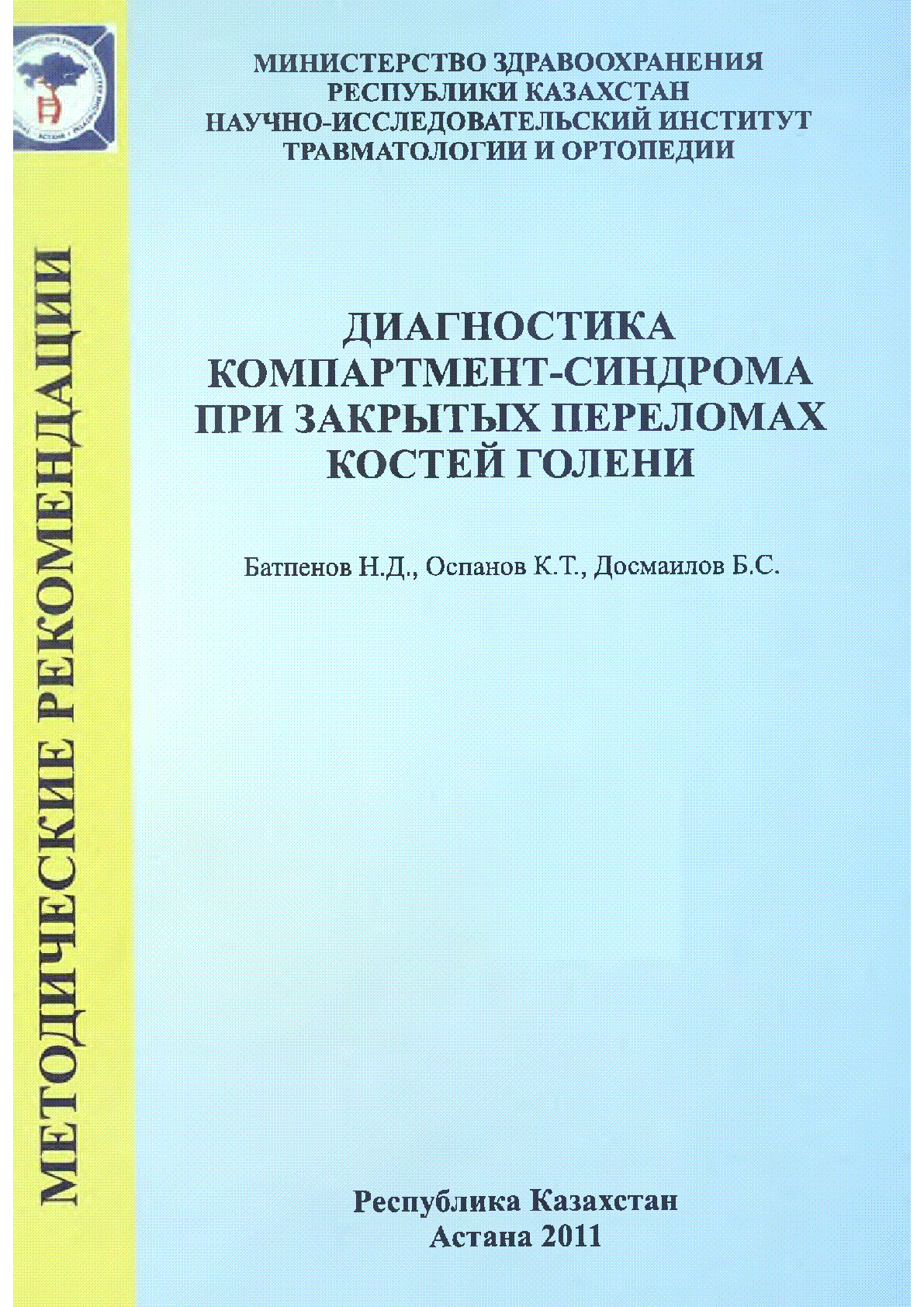 Диагностика компартмент-синдрома при закрытых переломах костей голени [Текст] : (методические рекомендации) / Н. Д. Батпенов Б. С. Досмаилов К. Т. Оспанов ; М-во здравоохранения РК, Научно-исследовательский ин-т травматологии и ортопедии... – Астана : [б. и.], 2011. - 19 c., ил.; . – Библиогр.: с. 18-19 . – 100 экз.