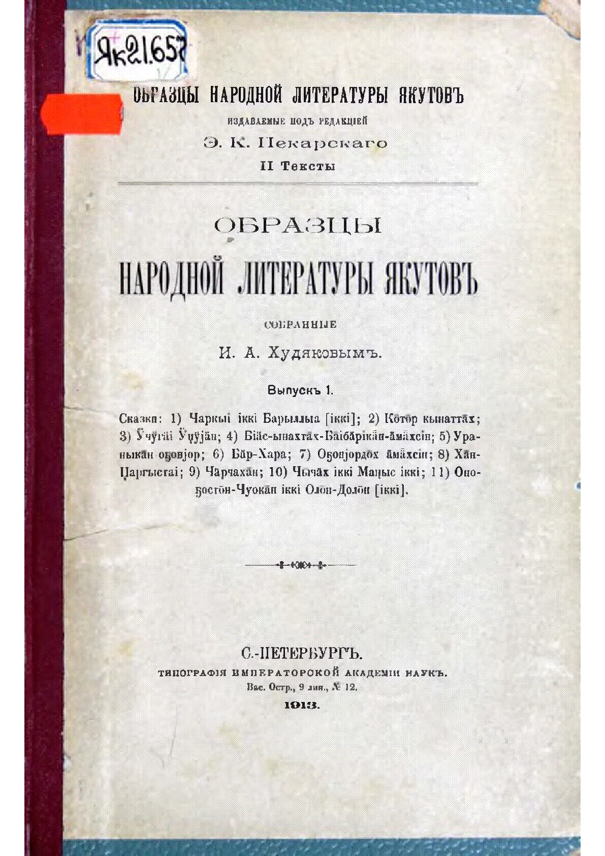 Образцы народной литературы якутов [Text] ; под ред. Э. К. Пекарского; собранные И. А. Худяковым .- Санкт-Петербург : Типография Императорской Академии Наук , 1913.– [б. т.] . - Текст на якутском языке . Т. 2, ч. 1, вып. 1 . Сказки– 190 с.