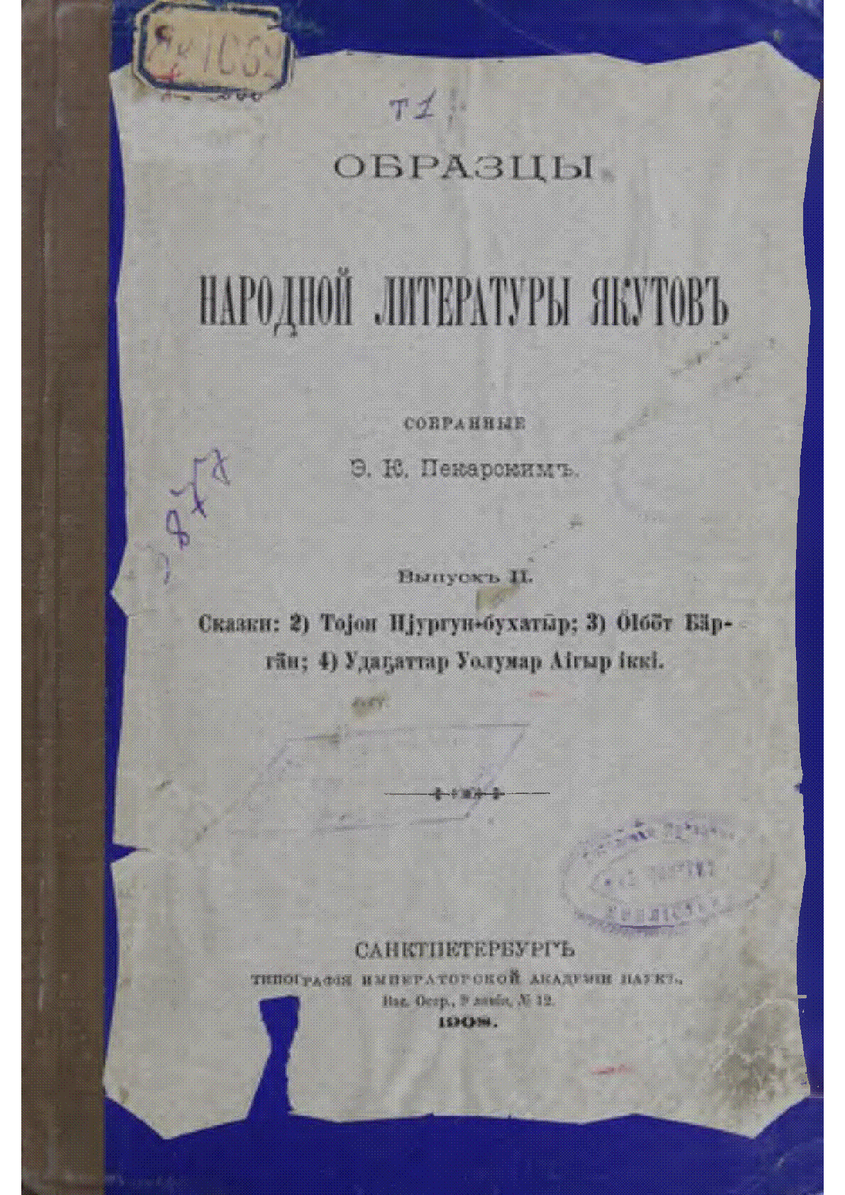 Образцы народной литературы якутов [Text] ; собранные Э. К. Пекарским .- Санкт-Петербург : Типография Императорской академии наук , 1908.– [б. т.] . - Текст на якутском языке . Т. 1, вып. 2 . Сказки– 194 с.