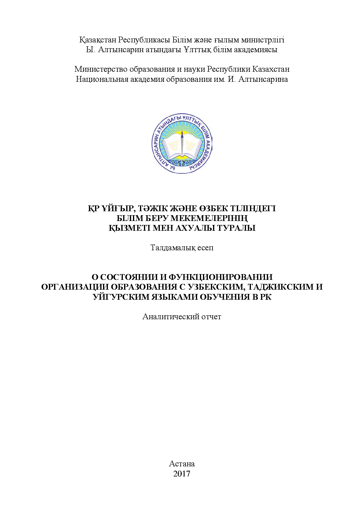Қазақстан Республикасындағы ұйғыр, тәжік және өзбек тіліндегі білім беру мекемелерінің қызметі мен ахуалы туралы = О состоянии и функционировании организации образования с узбекским, таджикским и уйгурским языками обучения в Республики Казахстан [Мәтін] : талдамалық есеп / ; ҚР білім және ғылым министрлігі, Ы. Алтынсарин ат. Ұлттық білім академиясы... – Астана : [б. ж.], 2017. - 359 б. - Мәтін қазақ және орыс тілд. . – Библиогр.: 179-180 б., 358 б. . – [т. ж.]
