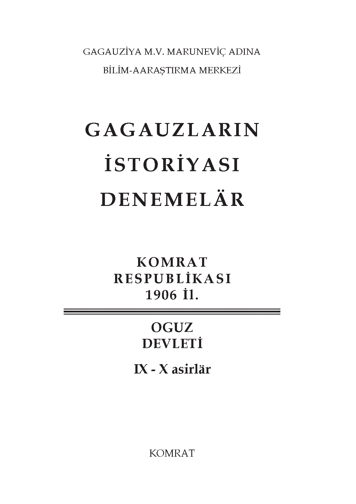 Gagauzlarin istoriyasi genemelar [Text] : Oguz devleti. IX-X asirlar / N. H. Tufar, Z. Kinayatuli , N. N. Tufar ; N. H. Tufar [et. al.] ; red. kol.: P. M. Pasali [et. al.]; Gagauziya M. V. Maruneviç adina bilim-aarastirma merkezi .- Komrat : [s. n.] , 2015.– [б. т.] . – 978-9975-3075-1-2 – 63, [5] p., ill. .