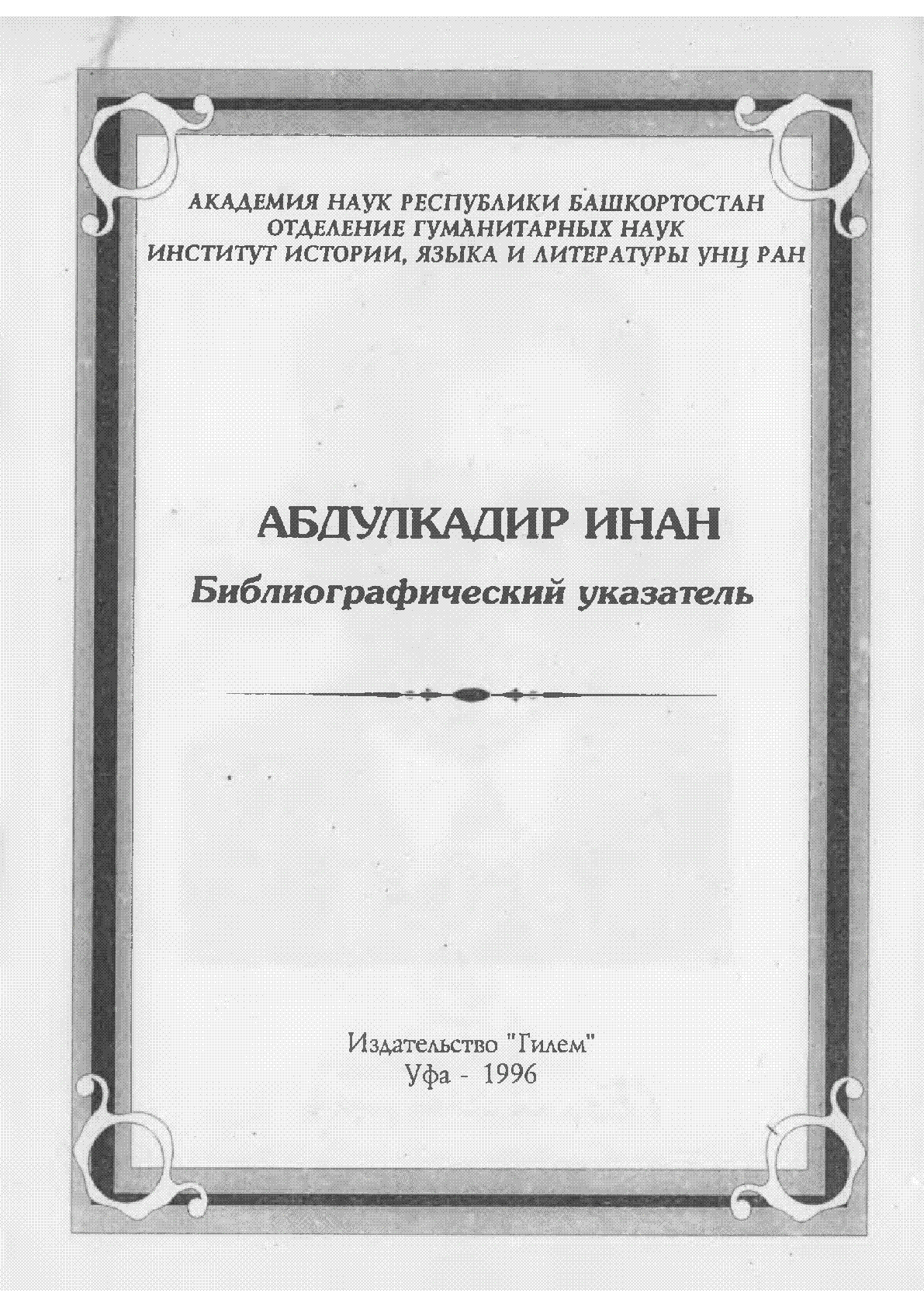 Абдулкадир Инан [Текст] : Библиографический указатель / ; [сост. и пер. на рус. яз. А. Г. Салихов; отв. ред. З. Г. Ураксин]; АН Башкортостана, Отд. гуман. наук, Ин-т истории, языка и литературы УНЦ РАН... – Уфа : Гилем, 1996. - 59, [1] с. . – Имен. указ.: - с. 56-59 . – 400 экз. – 5-7501-0032-4