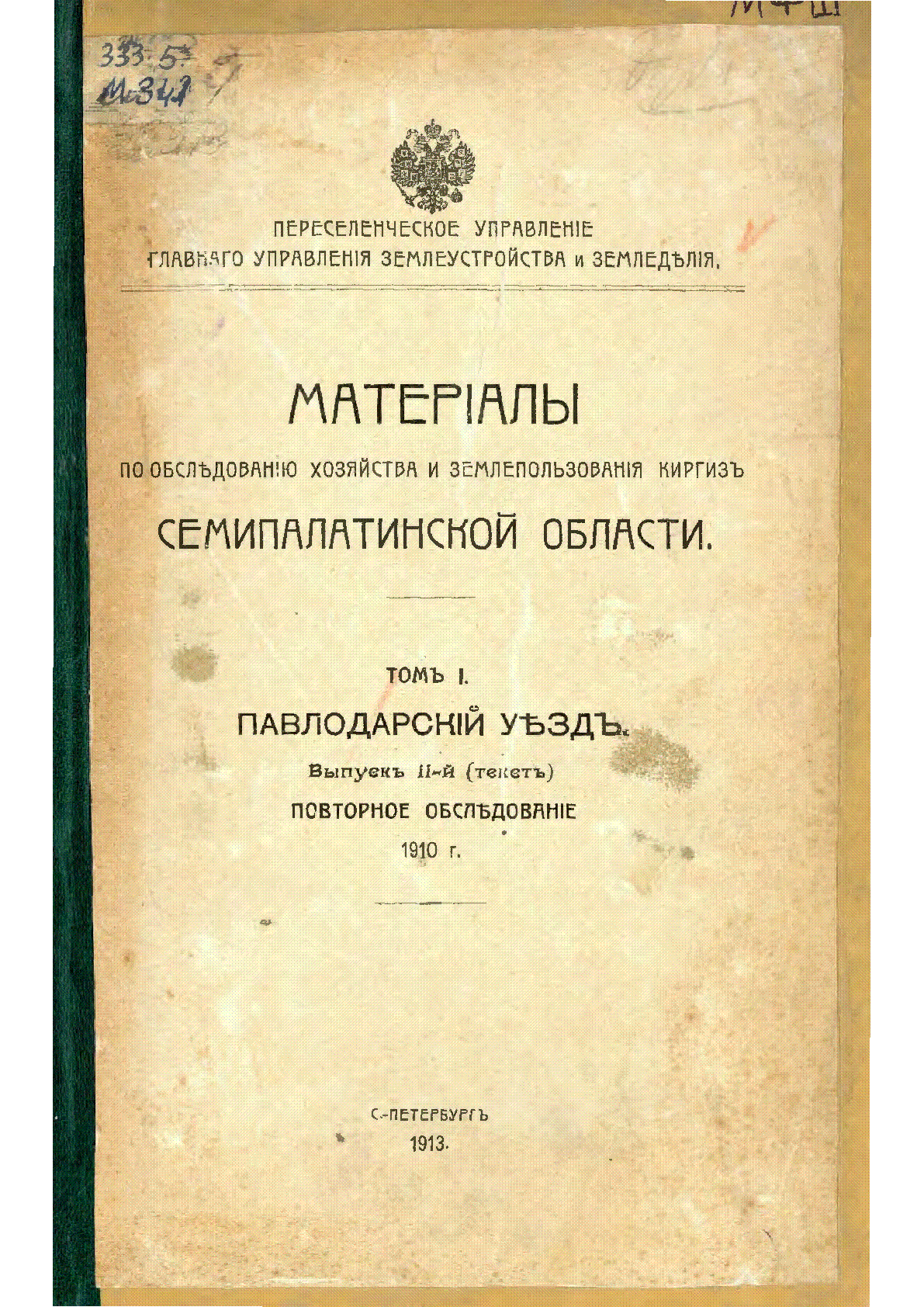 Материалы по обследованию хозяйства и землепользования киргиз Семипалатинской области. [Текст] : повторное обследование 1910 г. / ... – СПб. : Тип. "Экономия", 1913. ; Т.I В.II-й. (текст) : Повладарский уезд.). . .
