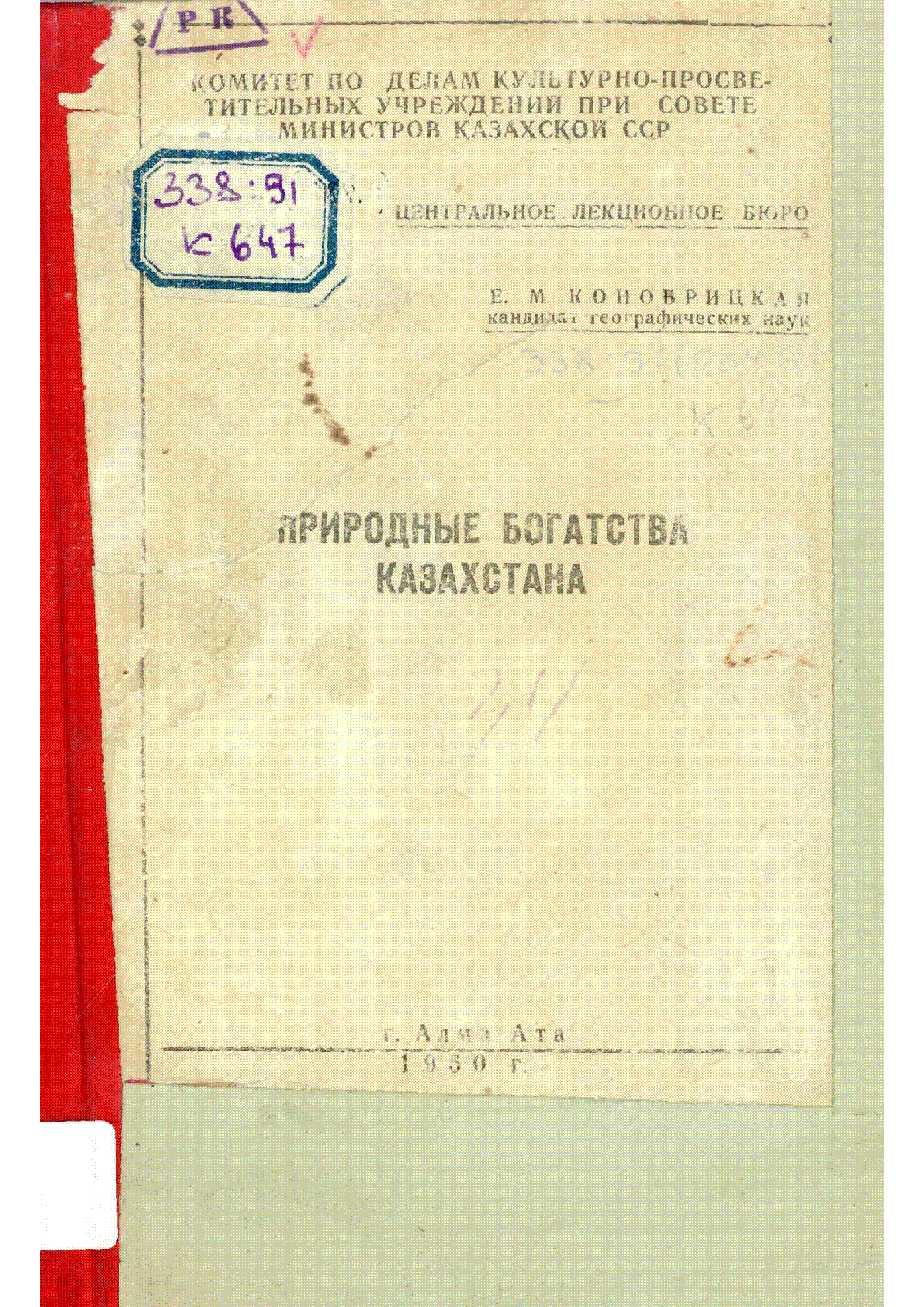 Природные богатства Казахстана [Текст] / Конобрицкая Е.М. ... – Алматы : Комитет по делам культ-просвет.учрежд.при Совмине КазССР, 1950. - 24с 21х14см - В кн.дарственный автограф автора. . . – 2 500 экз. : Б.ц.