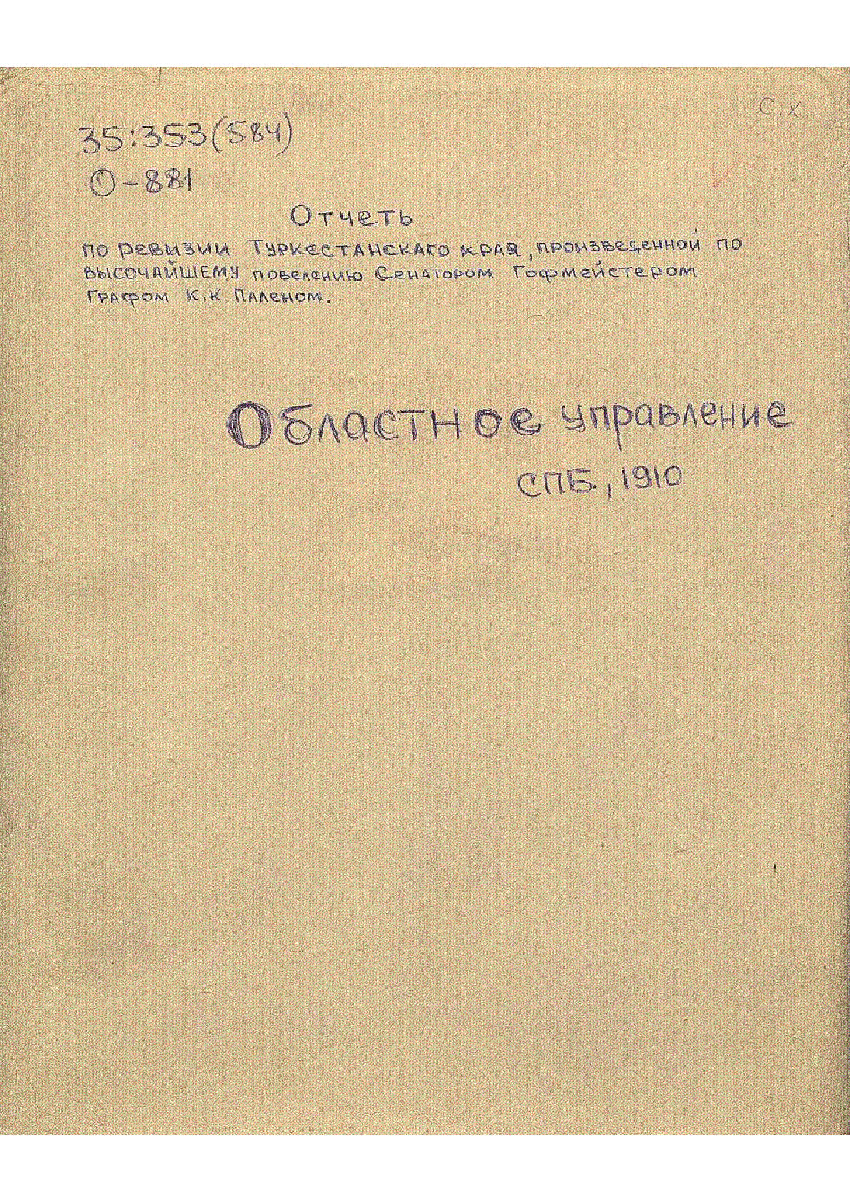Отчет по ревизии Туркестанского края, произведенной по высочайшему повелению сенатором гофмейстером графом К.К.Паленовым [Текст] : Областное управление / ... – СПб. : Сенатская типография, 1910. - 353 с., таблица; 26,5 х 23,5 . . – б.т. : б.ц.