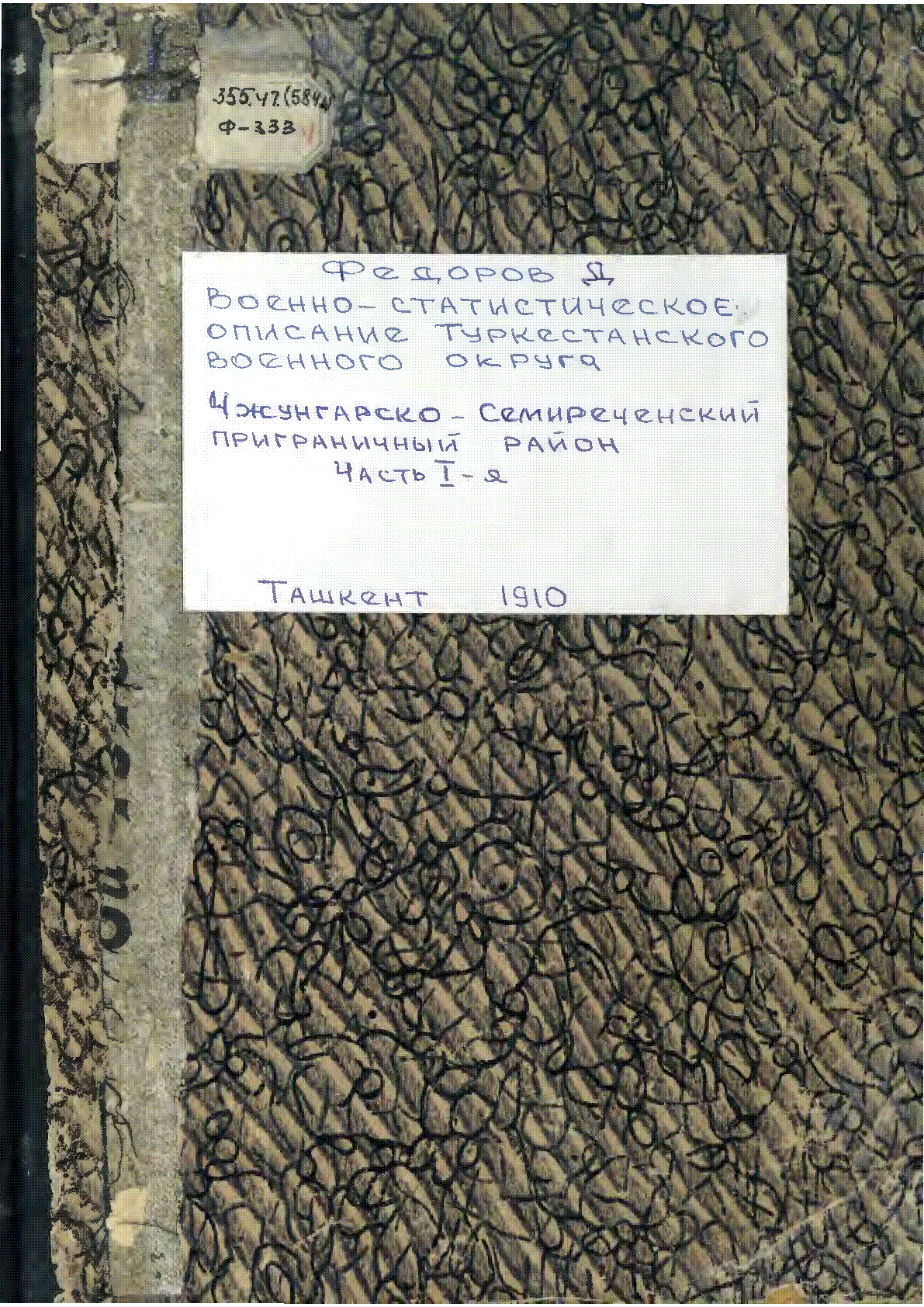 Военно-статистическое описание Туркестанского военного округа [Текст] / Федоров Д. ... – Ташкент : Тип. Штаба Туркестанского военного округа, 1910. - III+181 с. 28х21,5 см. - Издание Штаба Туркестанского военного округа, - Не подлежит оглашению., - Гражданский алфавит. . .
