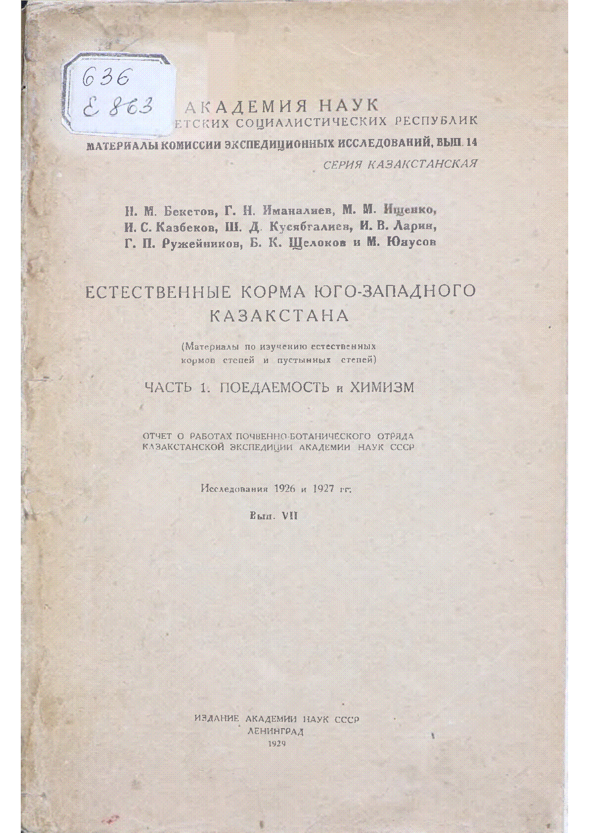 Естественные корма юго-западного Казахстана [Текст] : Мат-лы по изучению естественных кормов степей и пустынных степей- Ленинград : Издание академии наук СССР , 1929. – Серия казахстанская.– 1000 экз. . Ч. 1, вып. 7 . Поедаемость и химизм– 364 с., прил. . : 50 тг.