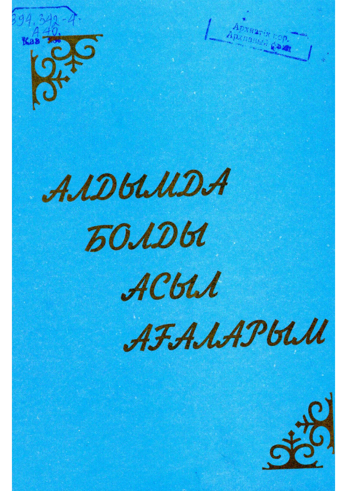 Алдымда болды асыл ағаларым [Мәтін] / ... – Қостанай : [б. ж.], 2002. - 101 б., [10] п. сурет.; . . – 100 дана – ISBN 9965-535-77-9 : 150 тг.