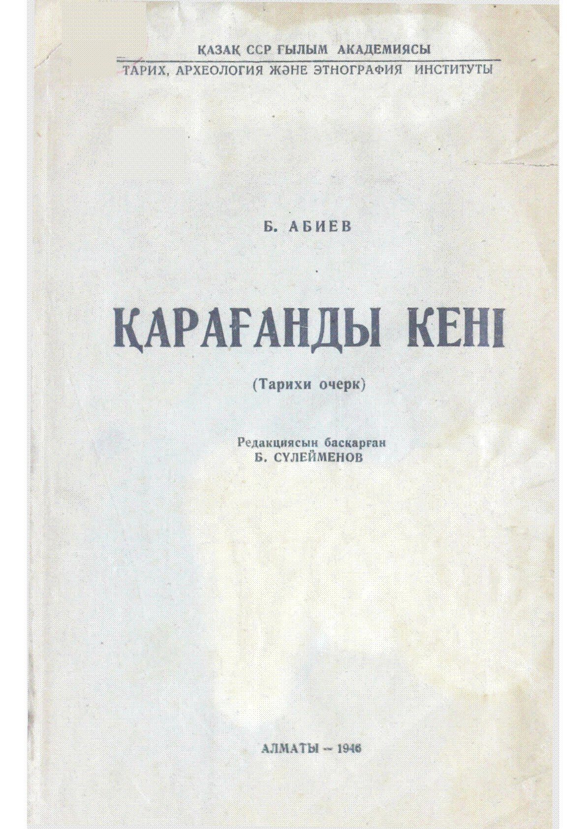 Қарағанды кені [Мәтін] : тарихи очерк / Б. Абиев ; ред. басқ. Б. С. Сулейменов ; Қазақ ССР Ғылым акад. ; Тарих, археология және этнография ин-ты... – Алматы : [б. ж.], 1946. - 75, [1] б. - Мәтін қаз., орыс тілд. . . – 1000 дана