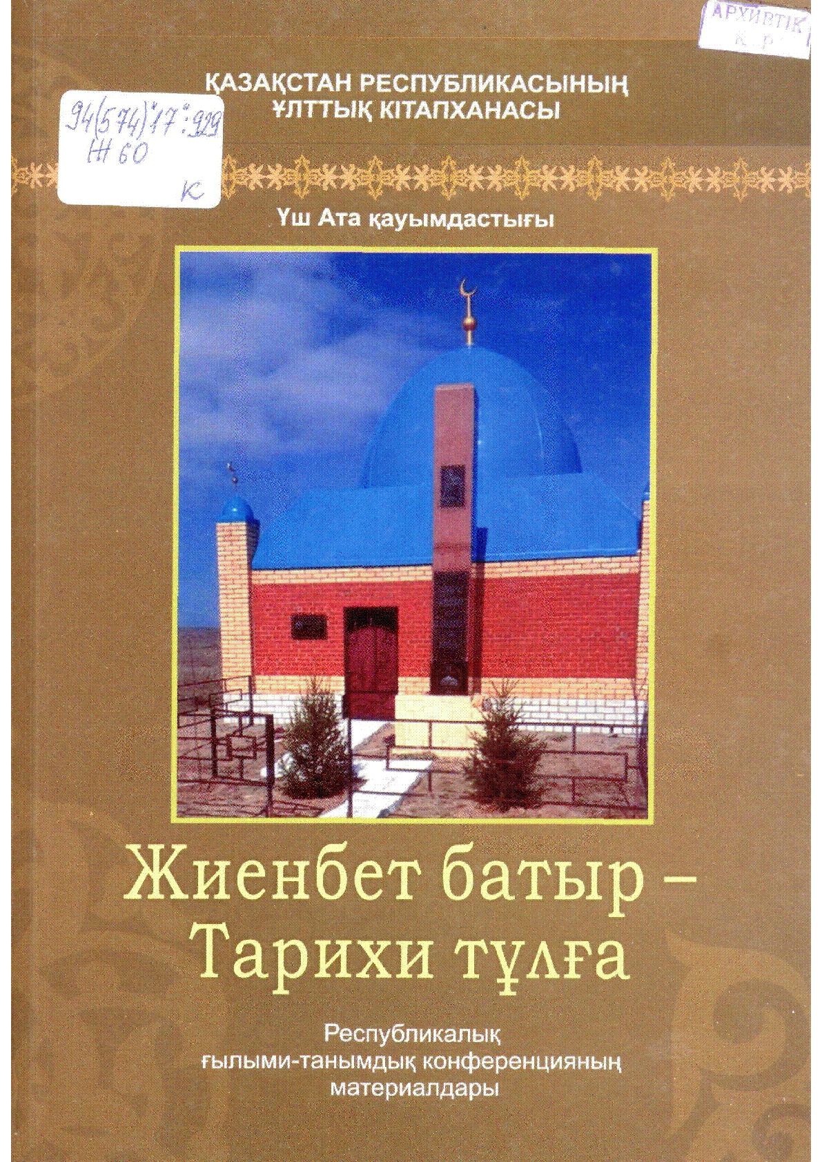 Жиенбет батыр - Тарихи тұлға [Мәтін] : республикалық ғылыми-танымдық конференцияның материалдары / ; Қазақстан Республикасының ұлттық кітапханасы ; Үш Ата қауымдастығы ; [редакторы А. Әбенұлы]... – Алматы : Palitra Press, 2019. - 79 б., [4] п. сурет; . – Библиогр. мақала соңында . – 200 дана – ISBN 978-601-80607-7-9 (в пер.)