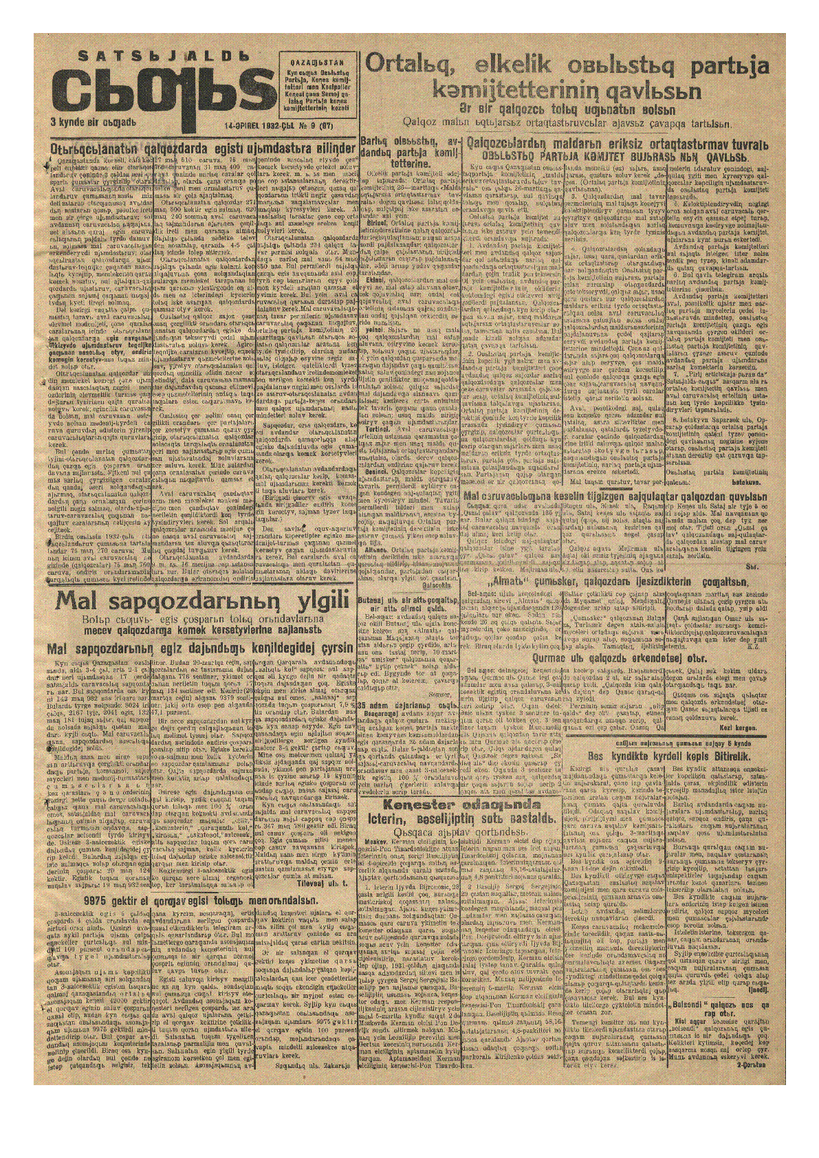 Социалды шығыс 1932, 14 апрель = Satsьjaldь сьgьs [Мәтін] ; ред. М. Нургалиев. – Семипалатинск : Тип. "Прииртышской Правды", 1932. - .– 300 экз..– Күнара шығады, (Құжатты көшіріп алып оқуыңызды сұраймыз). 1932. - № 9 (97). - 14 апрель. - 300 экз.
