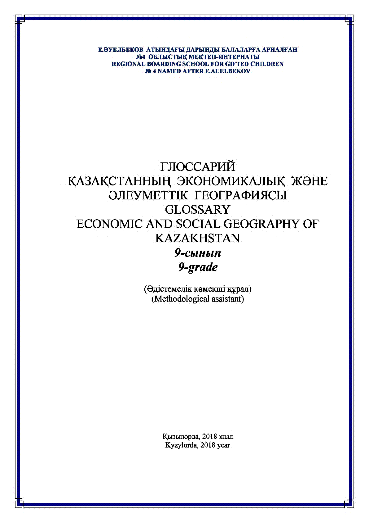 Глоссарий Қазақстанның экономикалық және әлеуметтік географиясы = Glossary Economic and social geography of Kazakhstan [Мәтін] : 9 сынып : (Әдістемелік көмекші құрал) / Б. Ә. Абдуллаева А. О. Сейсекеева ; Е. Әуелбаев атындағы дарынды балаларға арналған №4 облыстық мектеп интернаты... – Қызылорда : [б. ж.], 2018. - 27 б. - Мәтіні қазақ, ағылшын тілд. . – Библиогр.: 27 б. . – [т. ж.]